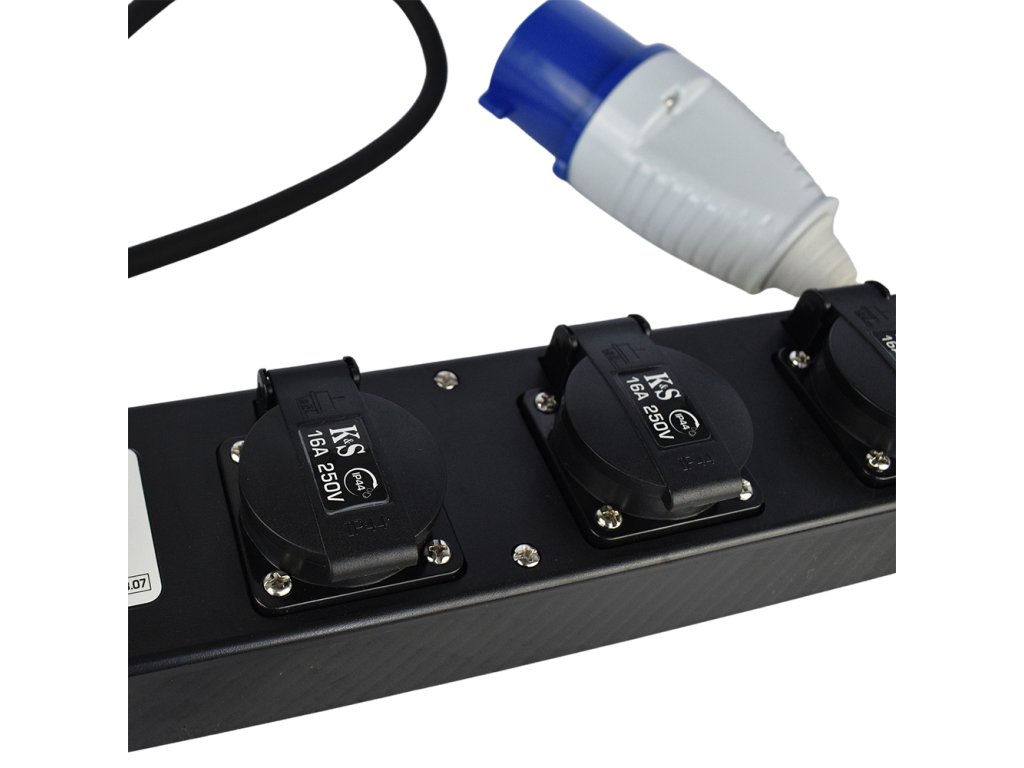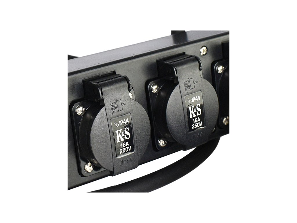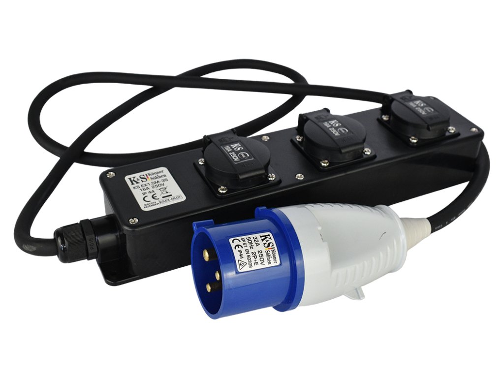 Adaptér KS EX1.5M-3S se třemi zásuvkami a délkou kabelu 1,5 m se používá v případech, kdy je nutné připojit domácí spotřebiče s normální zástrčku 16A k zásuvce 32A, například v elektrocentrále. Má třídu ochrany IP44, což vám umožňuje používat adaptér venku i při vysoké vlhkosti díky ochraně proti náhodnému vniknutí kapiček vody a pevných částic.
