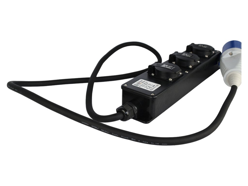 Na jedné straně má adaptér zástrčku 32A, na druhé straně – 3 x 16A zásuvku se zátěží až 5 kW.
