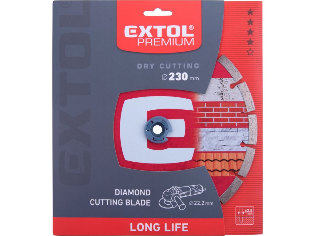 Řada diamantových řezných kotoučů LONG LIFE s prodlouženou životností pro profesionální a poloprofesionální použití.Díky složení diamantové směsi a výšce segmentu mají kotouče až o 50% větší řezný výkon než ostatní Extol Premium kotouče.