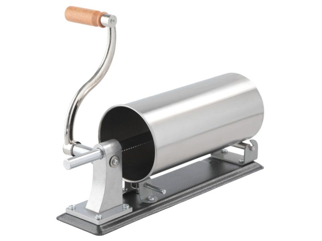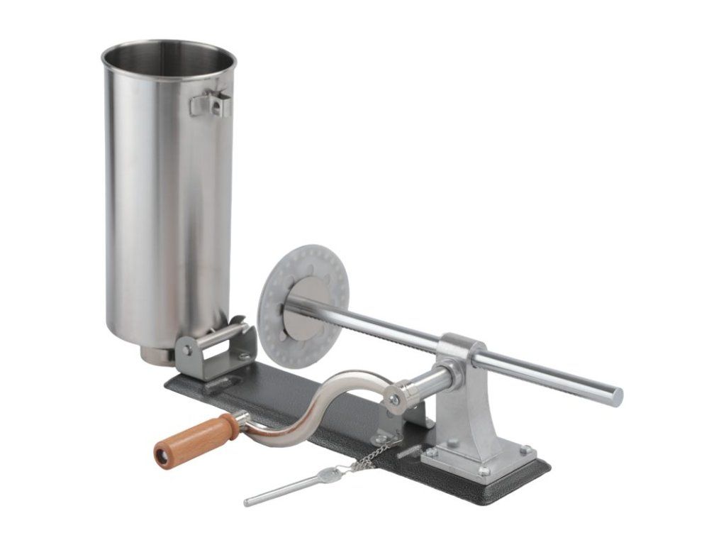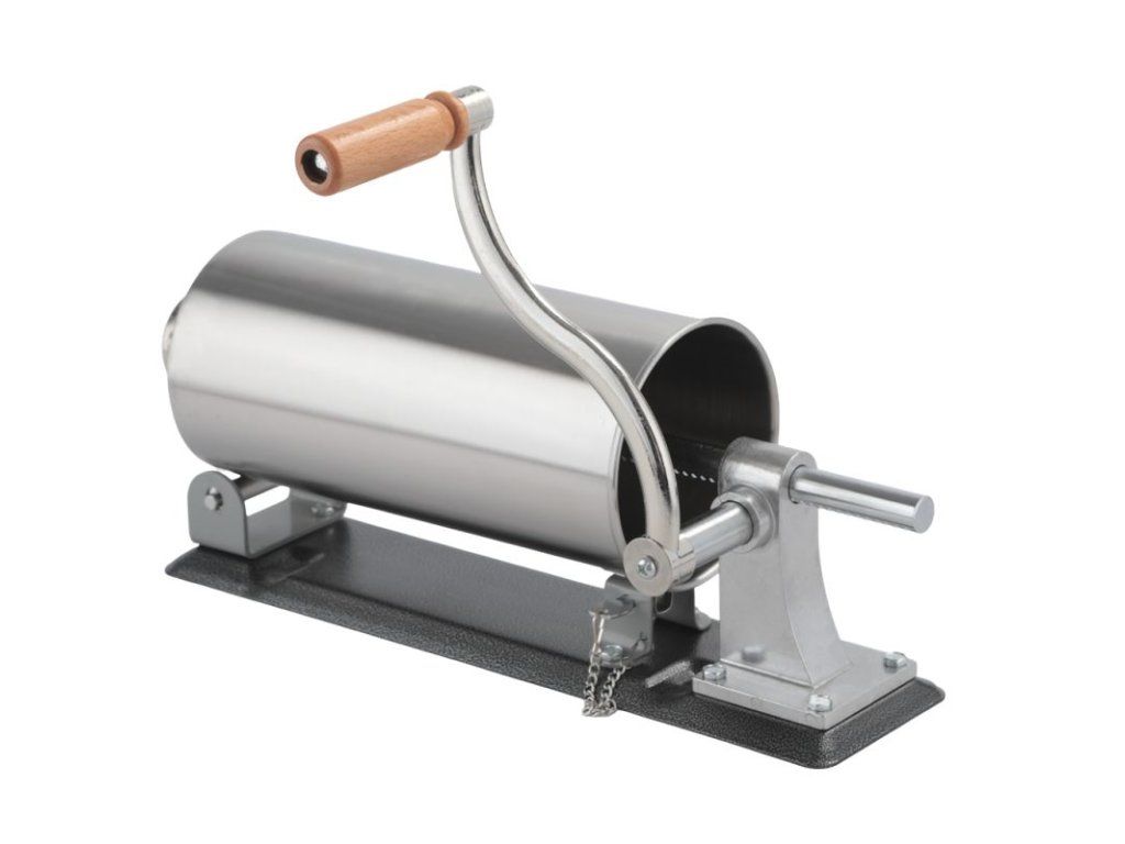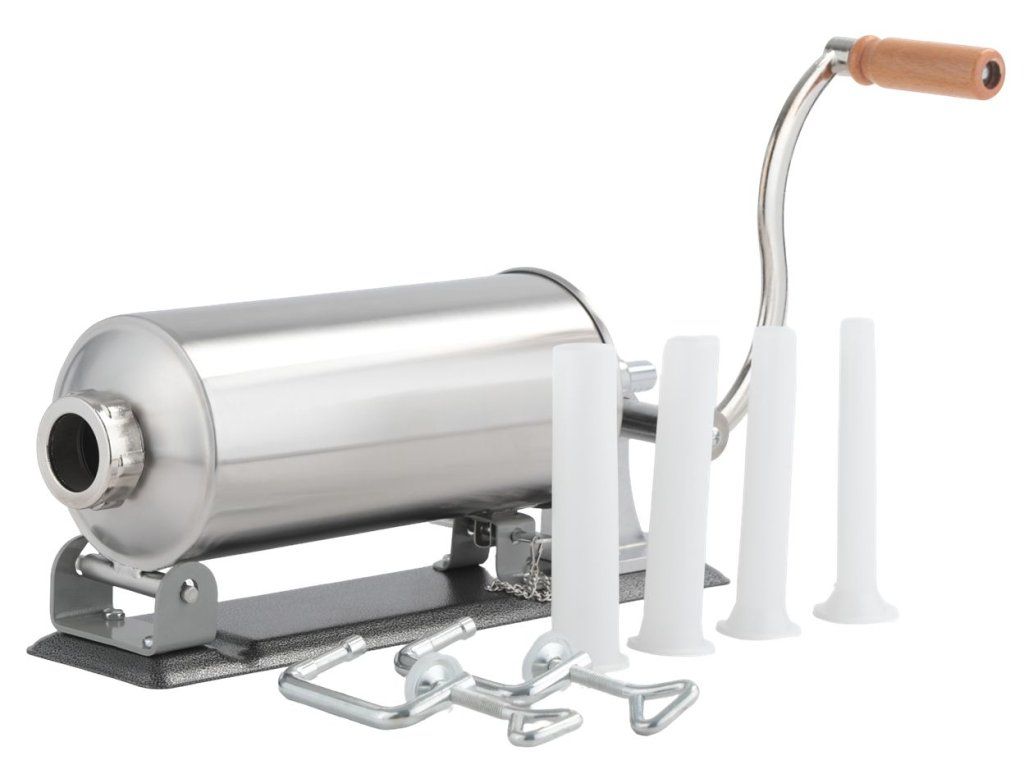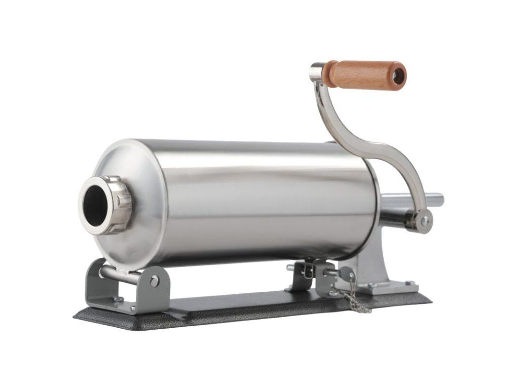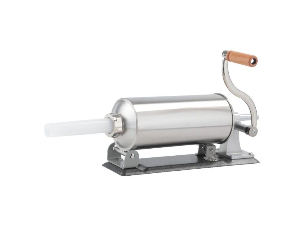 Praktická ruční plnička klobás pro rychlou domácí výrobu uzenin. Tělo z nerezové oceli a prvky ze slitiny hliníku zajišťují odolnost proti korozi a dlouhou životnost. Ruční klika, stabilní uchycení ke stolu dvěma úchyty a rozebíratelná konstrukce usnadňují obsluhu i čištění. Silikonový píst zaručuje dobrou těsnost a plynulý posuv náplně.