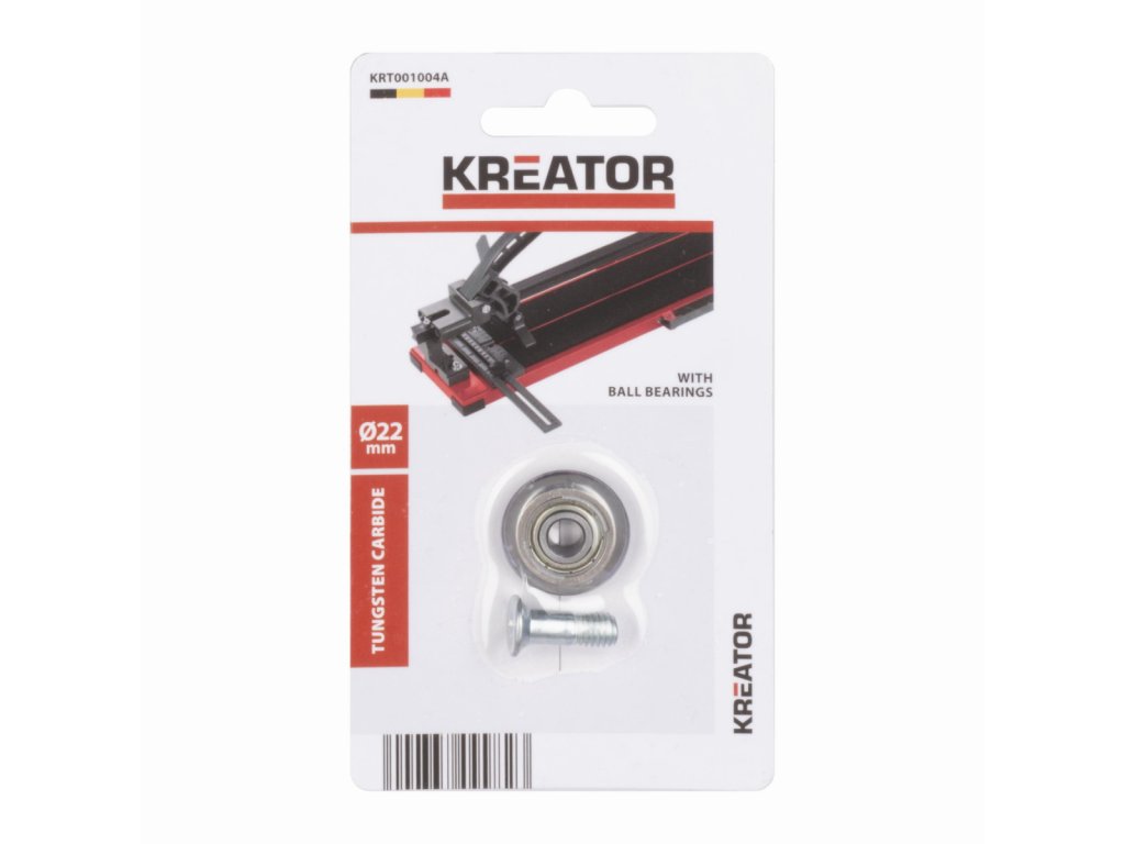 Potřebuje vaše řezačka dlaždic nový řezací kotouč? Toto řezací kolečko KRT001004A má průměr 22 mm a je kompatibilní s řezačkou dlaždic KRT001004 z řady Kreator.Navíc je osazeno kuličkovám ložiskem.