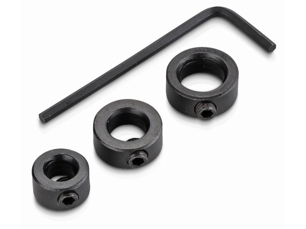 Tato sada obsahuje 3 dorazy vrtáků o průměru 6, 8 a 10 mm.Umožňují přesně nastavit hloubku vrtaného otvoru, což se hodí například při práci s kolíky nebo lamelami.