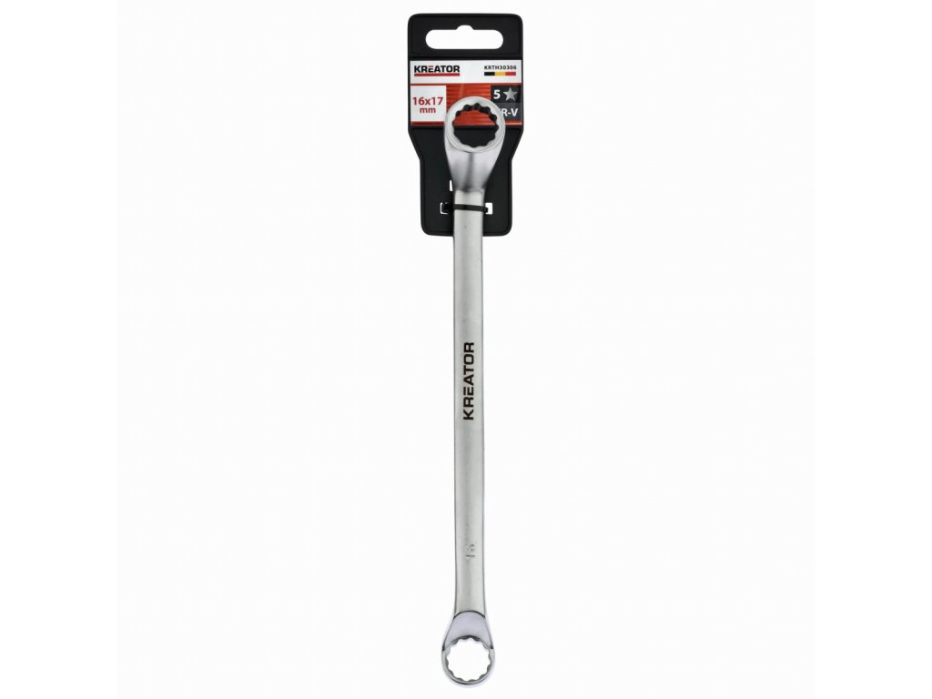 Tento dvojitý očkový klíč KRTH30306 z naší řady Kreator má délku 190 mm a je vyroben z vysoce kvalitní chrom-vanadiového slitiny.Osazené kroužky zajišťují efektivnější přenos vyvíjené síly.