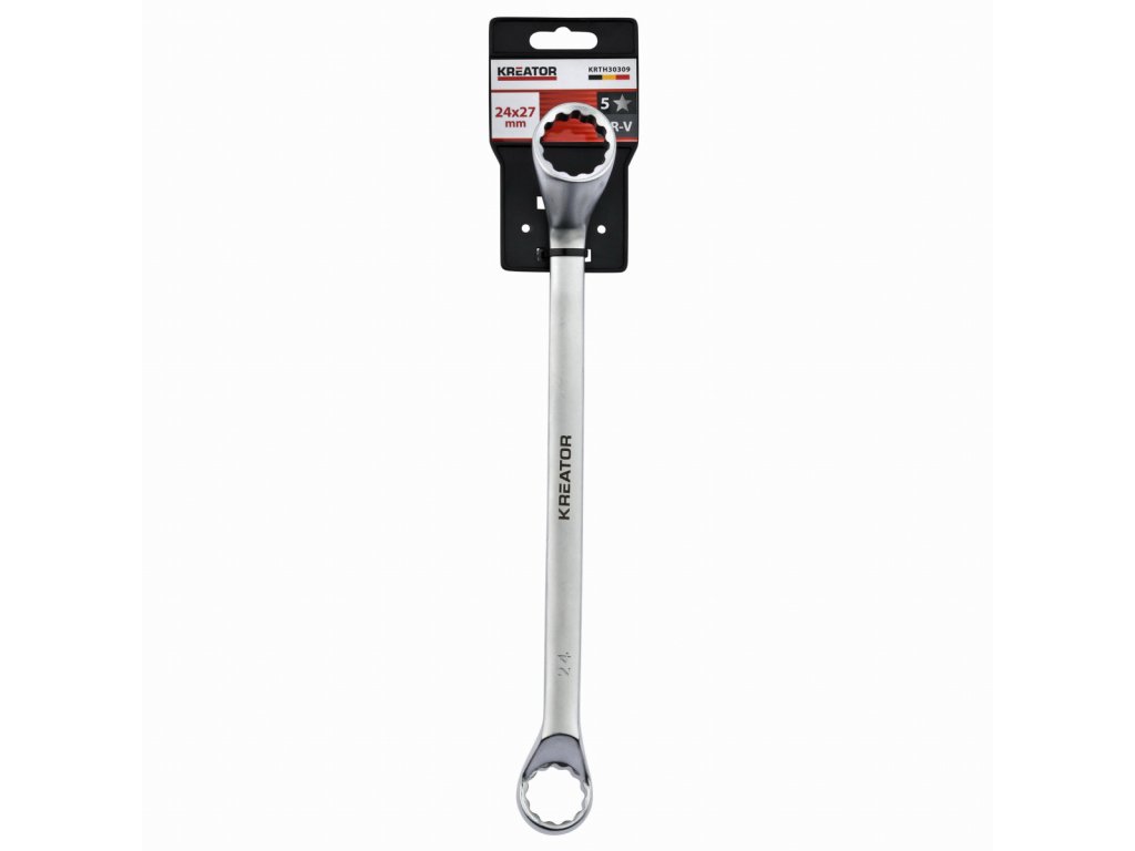 Tento dvojitý očkový klíč KRTH30309 z naší řady Kreator má délku 250 mm a je vyroben z vysoce kvalitní chrom-vanadiového slitiny.Osazené kroužky zajišťují efektivnější přenos vyvíjené síly.