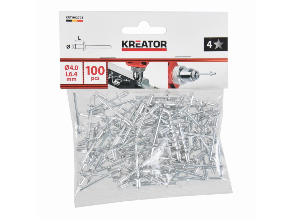 Tyto trhací nýty KRTH62703 z naší řady Kreator mají průměr 4,0 mm.Používejte je k rychlému a bezšroubovému spojení kovových, hliníkových nebo plastových předmětů o tloušťce až 3 mm.