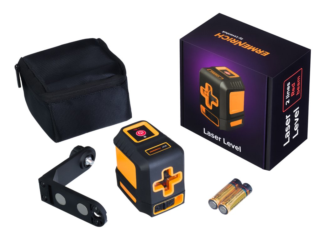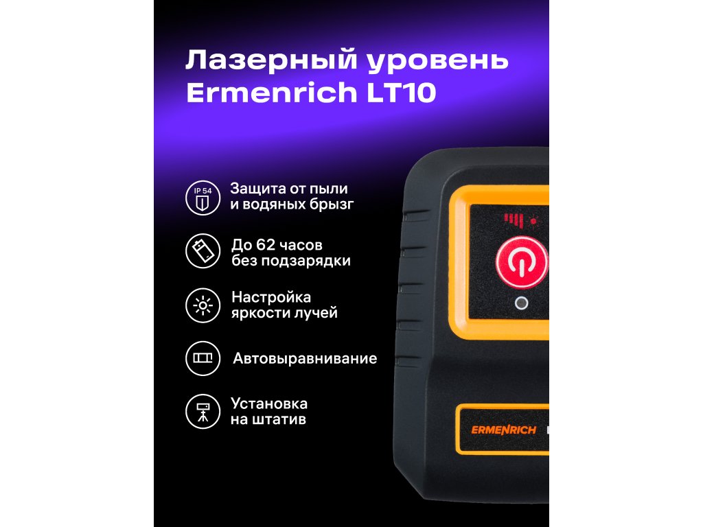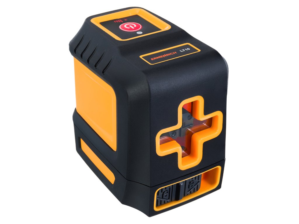 Laserový nivelační přístroj Ermenrich BASE LT10 generuje dvě červené čáry – svislou a vodorovnou. Může být použit pro mnoho dokončovacích úkolů: malování, omítání, obklady atd. Vodováha může být až 15 m daleko od povrchu, na který jsou promítány laserové paprsky. Laser má rozsah přes 130°. Napájen dvojicí standardních baterií dokáže zařízení fungovat až 62 hodin (s LED s nízkou svítivostí). K dispozici jsou celkem čtyři stupně jasu.