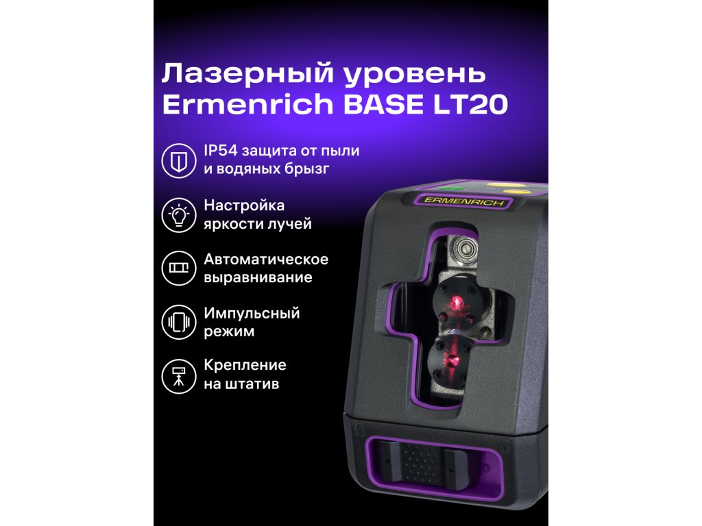 Ermenrich BASE LT20 lze namontovat na vodorovnou plochu nebo namontovat na standardní stativ. Pomocí stativu s naklápěcí hlavou můžete naklonit vodováhu, abyste získali požadovanou konfiguraci laserové linie. Zařízení je odolné proti prachu a postříkání vodou, což je zvláště cenné v prostředí renovace a výstavby. Hladina je napájena standardními bateriemi. K dispozici je 10 úrovní jasu.