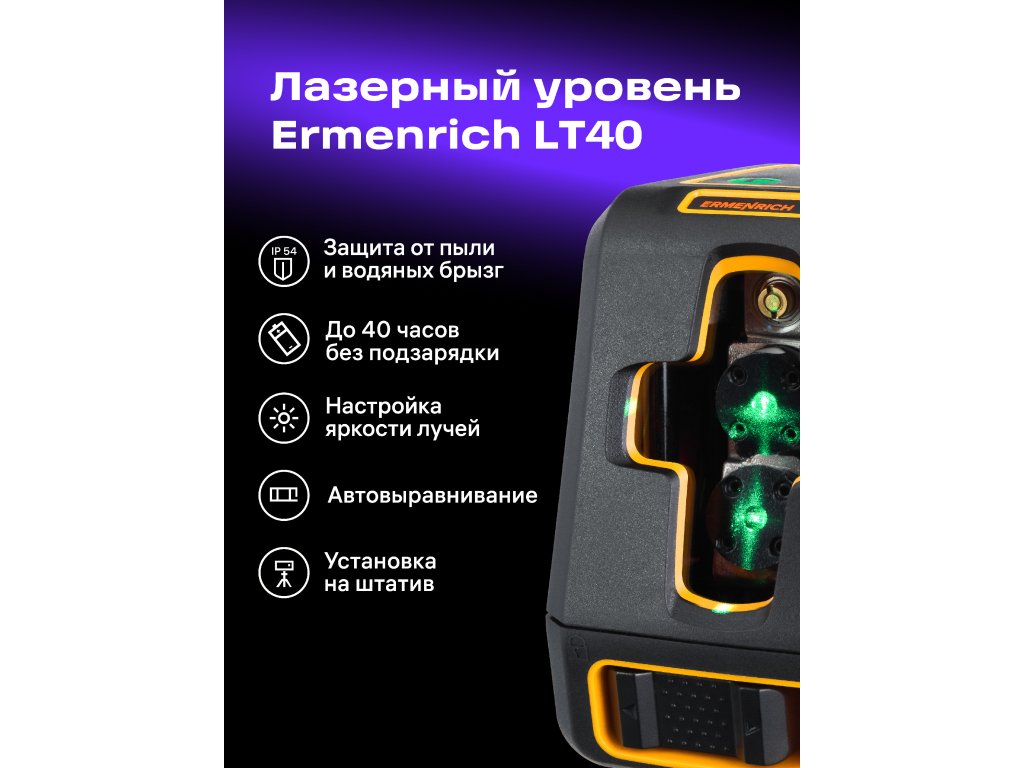 Laserový nivelační přístroj Ermenrich BASE LT40 může být umístěn až 30 metrů od povrchu, na který jsou promítány laserové paprsky. Lze jej také připevnit na stativ se standardním stativovým držákem. Kompenzátor automaticky vyrovnává linie laserového paprsku, což pomáhá dosáhnout přesného výsledku. Třída ochrany proti prachu a vodě IP54 vám umožňuje používat laserovou vodováhu v oblastech ve výstavbě, aniž byste se museli starat o bezpečnost zařízení.