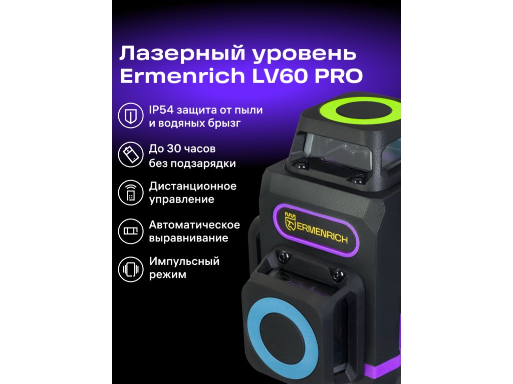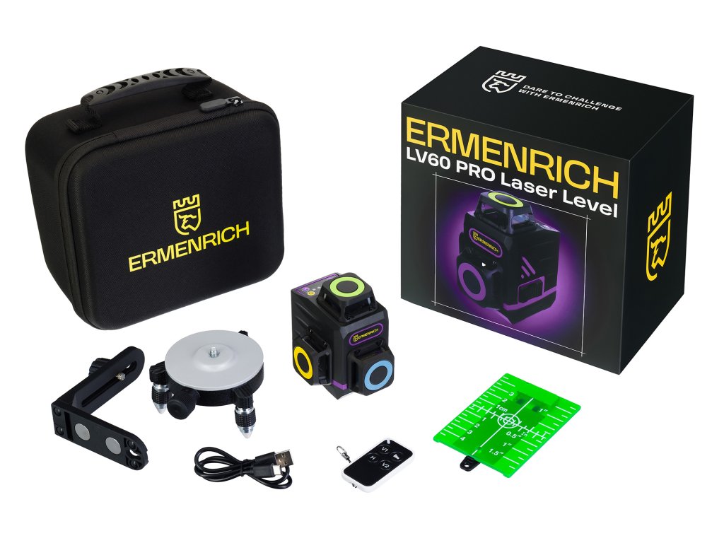 Další výhodou Ermenrich PRO LV60 je vestavěný kompenzátor, který snižuje vibrace a automaticky vyrovnává laserovou rovinu. Přijímač laserového paprsku (cílová deska) vám pomůže dosáhnout maximální přesnosti. Vestavěná dobíjecí baterie poskytuje dlouhotrvající provoz bez dobíjení, zatímco dálkové ovládání je napájeno bateriemi. Zařízení je navrženo pro použití v širokém teplotním rozsahu a je odolné vůči prachu a pronikání vody následkem stříknutí. Na výběr jsou čtyři úrovně jasu laseru, takže je snadné vybrat tu správnou pro jakékoli světelné podmínky.
