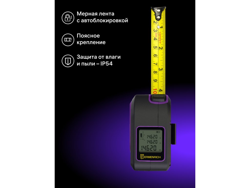 Laserový měřič provádí rychlá a velmi přesná měření až do vzdálenosti 60 metrů, zatímco 5metrový svinovací metr lze použít ručně. Přístroj je vyroben z odolného ABS plastu. Je nárazuvzdorný a nerozbitný a má také stupeň krytí IP54 proti stříkající vodě a prachu. Zadní panel přístroje je vybaven podsvíceným LCD displejem. Přístroj Ermenrich Reel SLR640 má navíc funkci hlasového upozornění – po aktivaci přístroj nahlas přečte výsledky měření.
