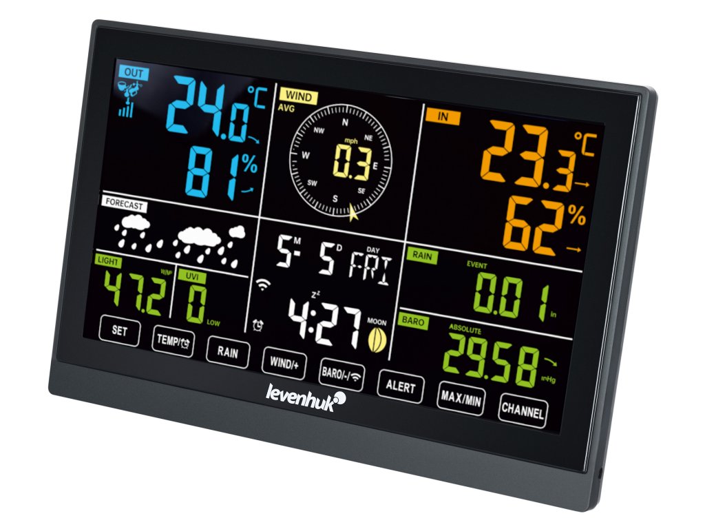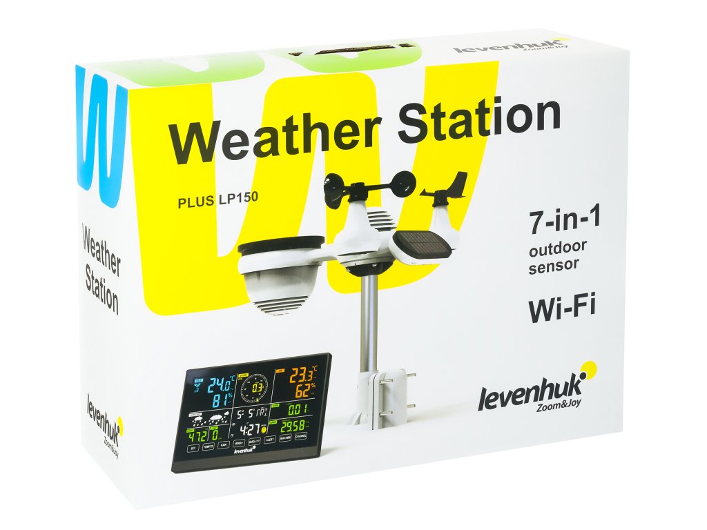 Levenhuk Wezzer PLUS LP150 je profesionální meteorologická stanice pro měření atmosférického tlaku, vlhkosti vzduchu, teploty, rychlosti a nárazů větru, množství a intenzity srážek, úrovně osvětlení a ultrafialového indexu. Veškerá měření se provádějí pomocí jednoho dálkového senzoru. Stanice také obsahuje funkce hodin s budíkem a kalendářem, přičemž datum a čas se nastavují automaticky pomocí synchronizace se serverem. K ovládání a zobrazení naměřených hodnot slouží barevný displej.