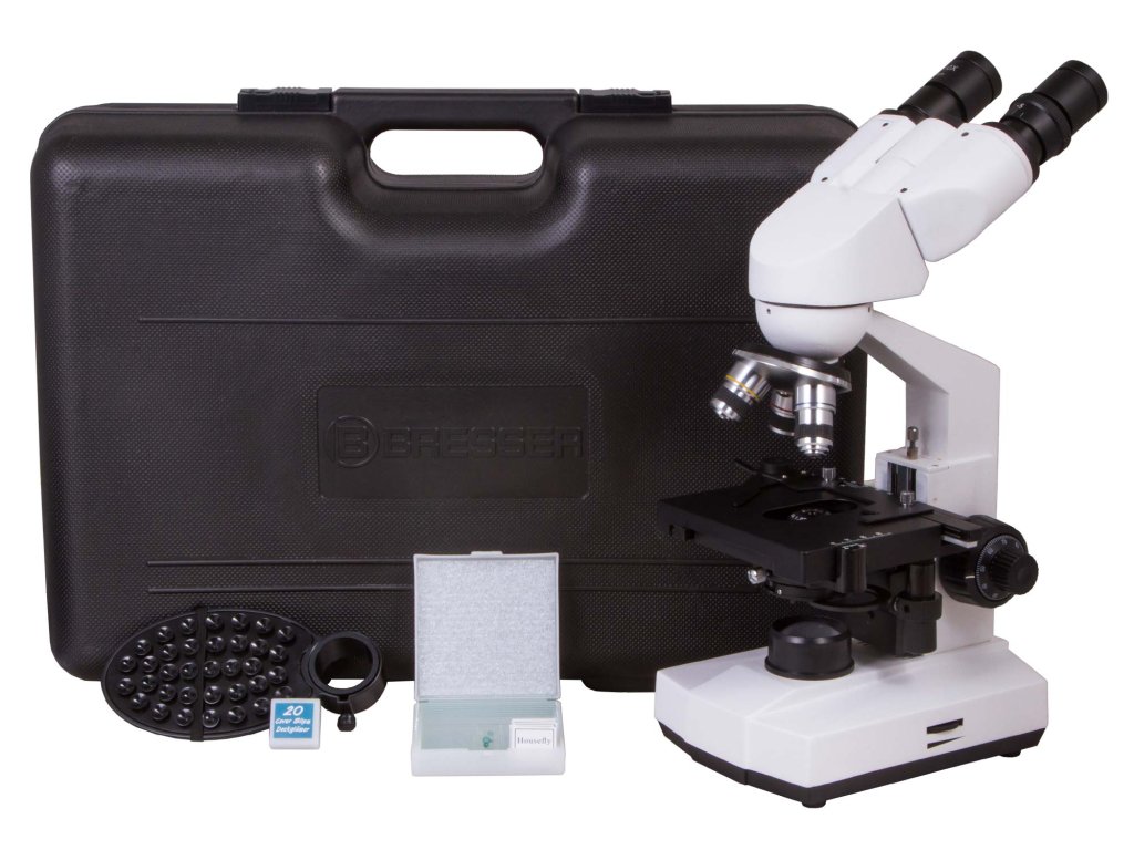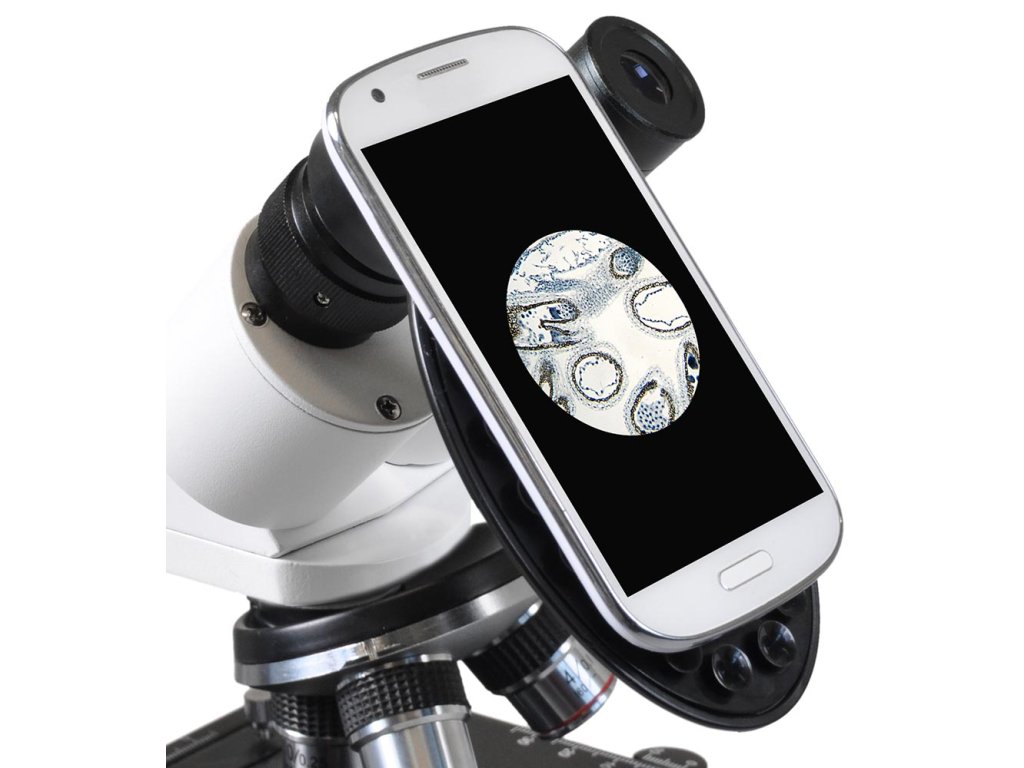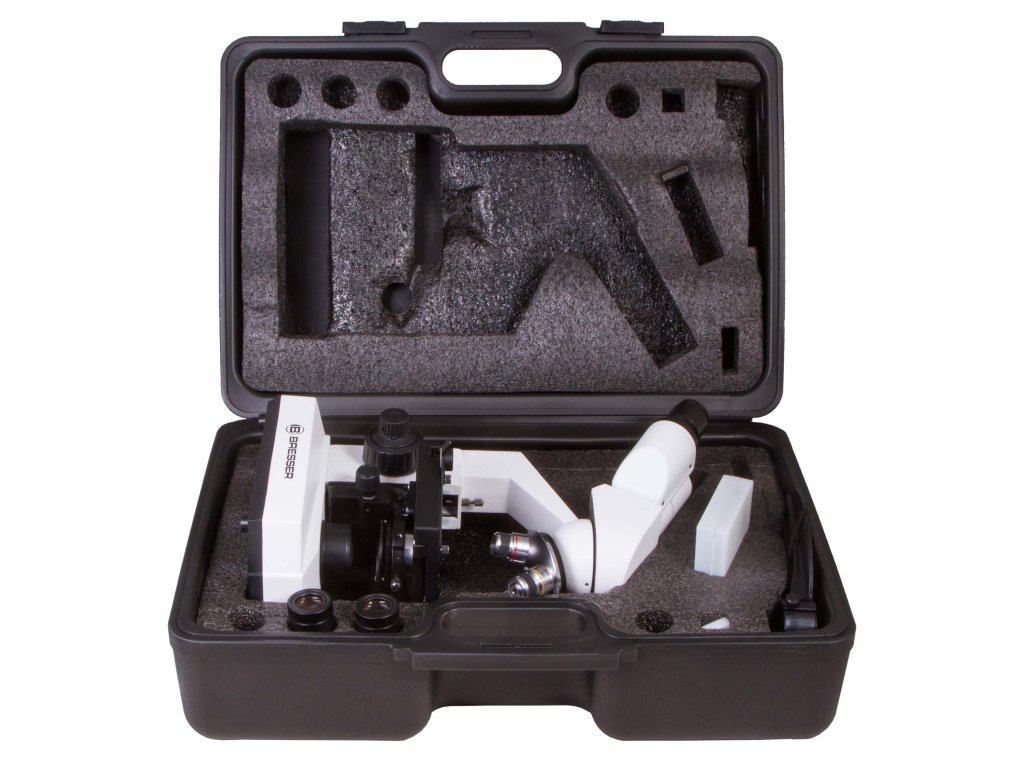The Bresser Erudit Basic 40–400x comes with a sturdy case for transport and storage, as well as with a smartphone holder for easy and convenient documentation of microscopic images and video.