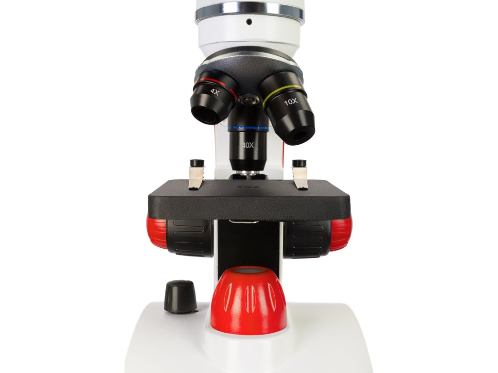 Sklíčka se upevňují na stolek pomocí svorek. Pod stolkem je kotoučová aperturní clona pro regulaci světelného toku ze spodního LED osvětlení. Mikroskop je vybaven hrubým a jemným zaostřováním, takže ostrost je možno nastavit rychleji a pohodlněji. Tělo mikroskopu je vyrobeno z kovu.