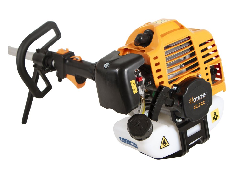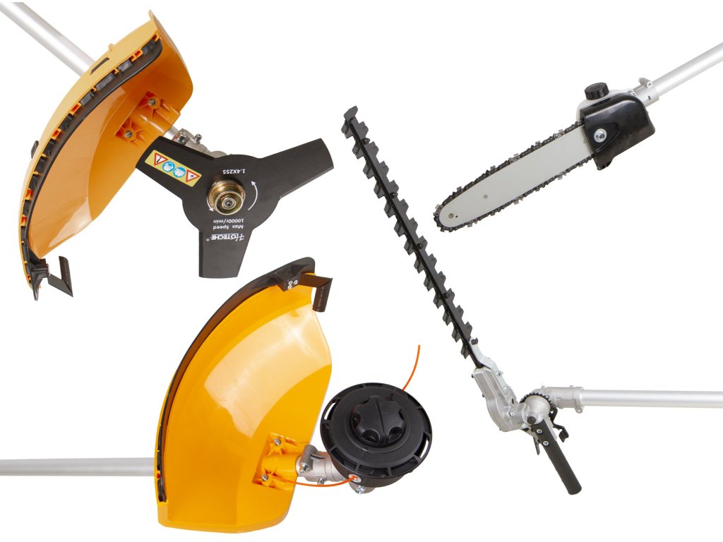 Multifunkční křovinořez 4v1 od značky Hoteche v sobě skrývá křovinořez, strunovou sekačku, nůžky na živý plot a motorovu pilu.