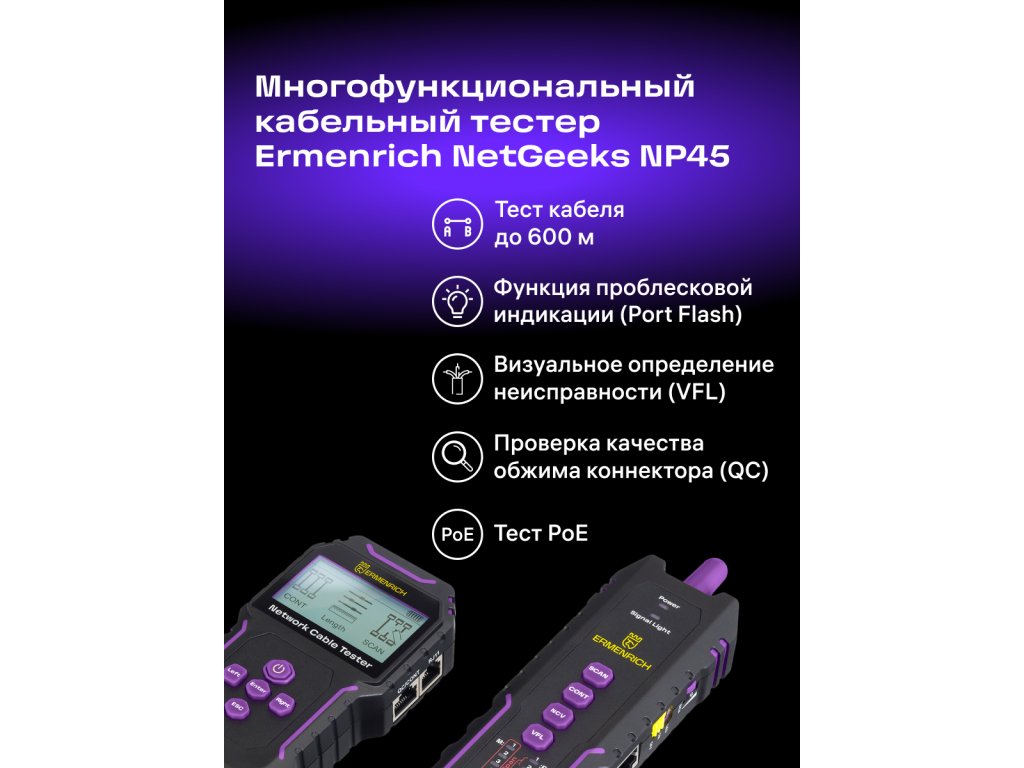 Funkce Port Flash na testeru vám pomůže najít kabel připojený k síťovému portu na přepínači nebo směrovači. Přístroj má funkci NCV pro bezkontaktní detekci nebezpečného napětí. Přístroj může také provádět test PoE, který pomáhá určit typ PSE, a detekuje střední/koncové rozpětí. Funkce VFL (Visual Fault Locator – Vizuální lokátor poruch) umožňuje pomocí světelných signálů přístroje vyhledat ohyby a poškození kabelu. Přístroj Ermenrich NetGeeks NP45 lze použít k měření délky kabelu metodou reflektometrie v časové oblasti (TDR) (v rozsahu 2,5 až 200 m). Maximální délka kabelu při testování je 600 m.