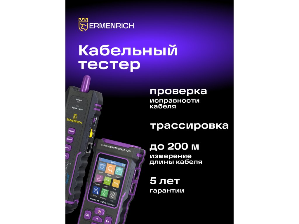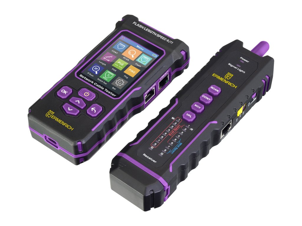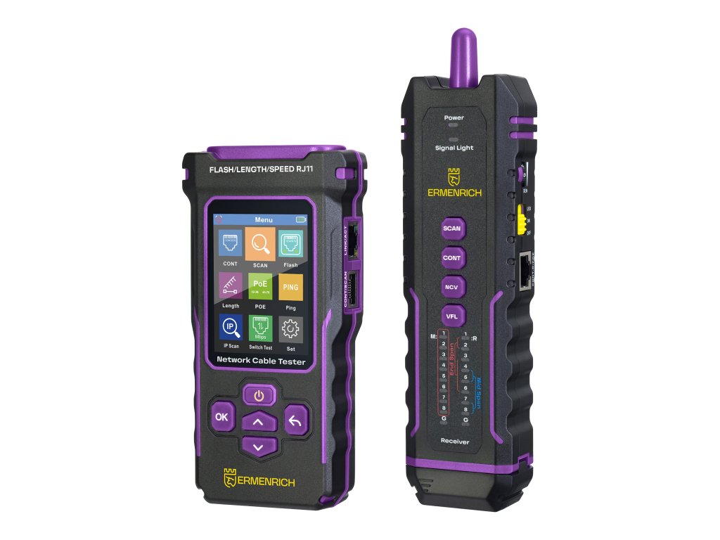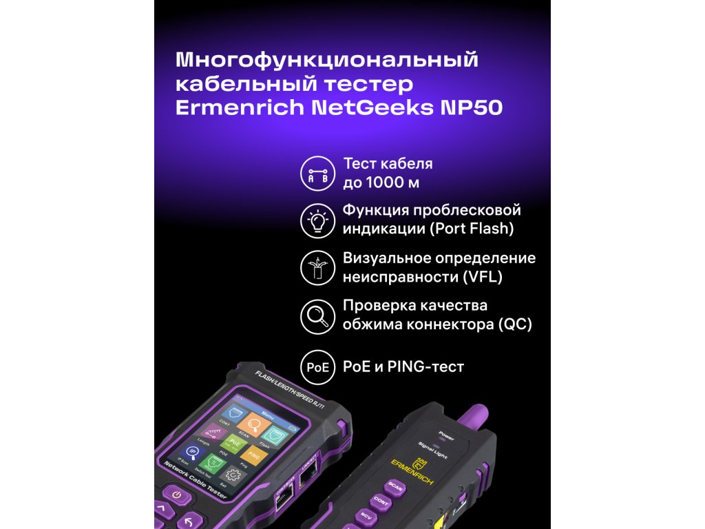 Přístroj má mnoho funkcí, které jsou užitečné pro odborníky, kteří instalují, udržují a opravují sítě v průmyslovém, kancelářském i domácím prostředí. Model Ermenrich NetGeeks NP50 lze použít k provádění testů sítě Ethernet: PoE (identifikuje typ PSE a střední/koncové rozpětí) a PING (měří rychlost přenosu paketů, zjišťuje IP adresu). Funkce Port Flash umožňuje rychle zjistit, ke kterému portu na směrovači nebo přepínači je kabel připojen. Pomocí funkce Visual Fault Locator (VFL – Vizuální lokátor poruch) můžete lokalizovat poruchy sítě na základě světelných signálů přijímače. Světelná indikace je přítomna také ve funkci bezkontaktní detekce napětí (NCV). Všechny výsledky diagnostiky se zobrazují na barevné TFT obrazovce vysílače.
