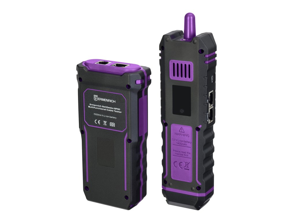 Multifunkční tester kabelů Ermenrich NetGeeks NP50 je určen k testování síťových kabelů STP/UTP kategorií 5/5E/6/6A, měření délky kabelů metodou reflektometrie v časové oblasti (TDR) (v rozsahu 5–200 m), provádění komplexní diagnostiky telefonních a počítačových sítí a detekci kroucených dvoulinek. Přístroj identifikuje místo přerušeného obvodu nebo zkratu ve vedení, změří přibližnou vzdálenost k místu poruchy a také detekuje zkřížené dvojlinky. Maximální délka testovaného kabelu: 1000 m.