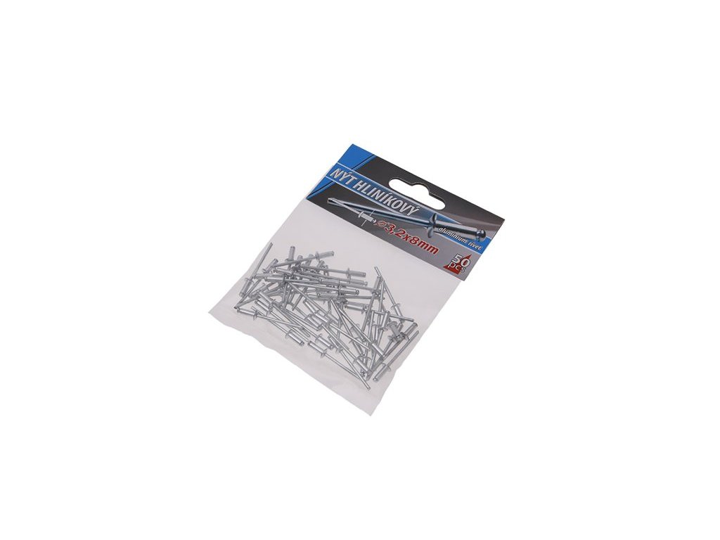Klasické trhací slepé aluminiové nýty průměr 3,2 mm délka 8 mm v malém balení 50 kusů, vhodné pro malospotřebitele.Doplňkové parametry