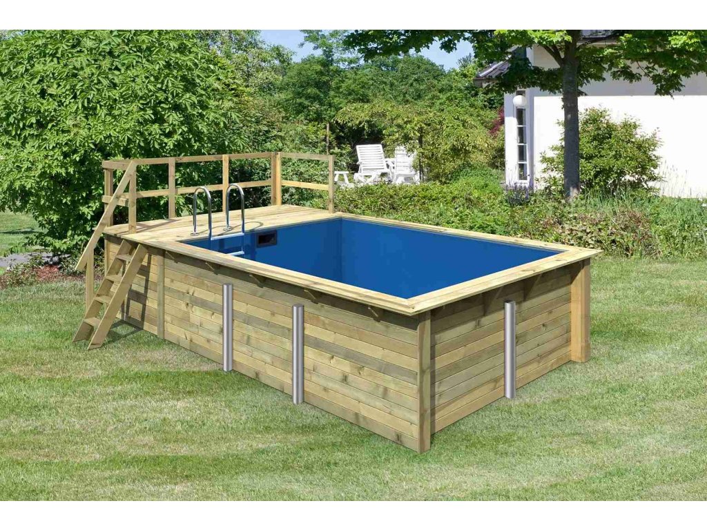 Konstrukce bazénu je vyrobena z dřevěných profilů (systém dvojité pero / drážka) síly 44 mm. Vnitřní prostor je vyplněn pevnou modrou PVC fólií o síle 0,6 mm.