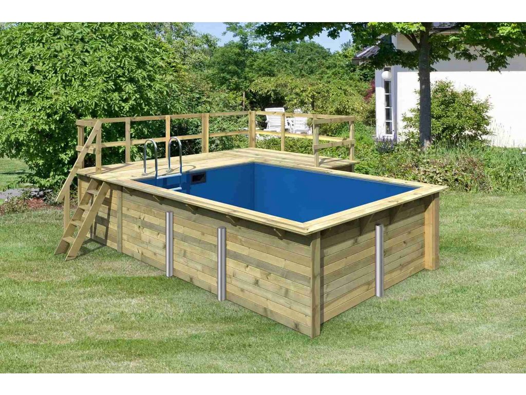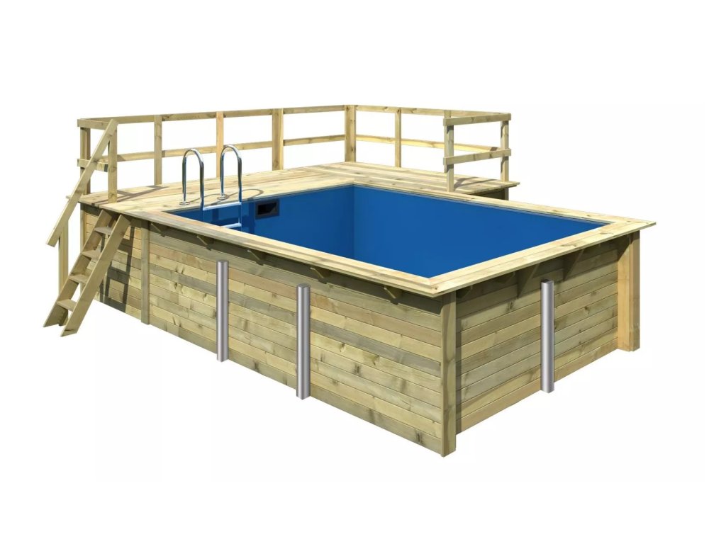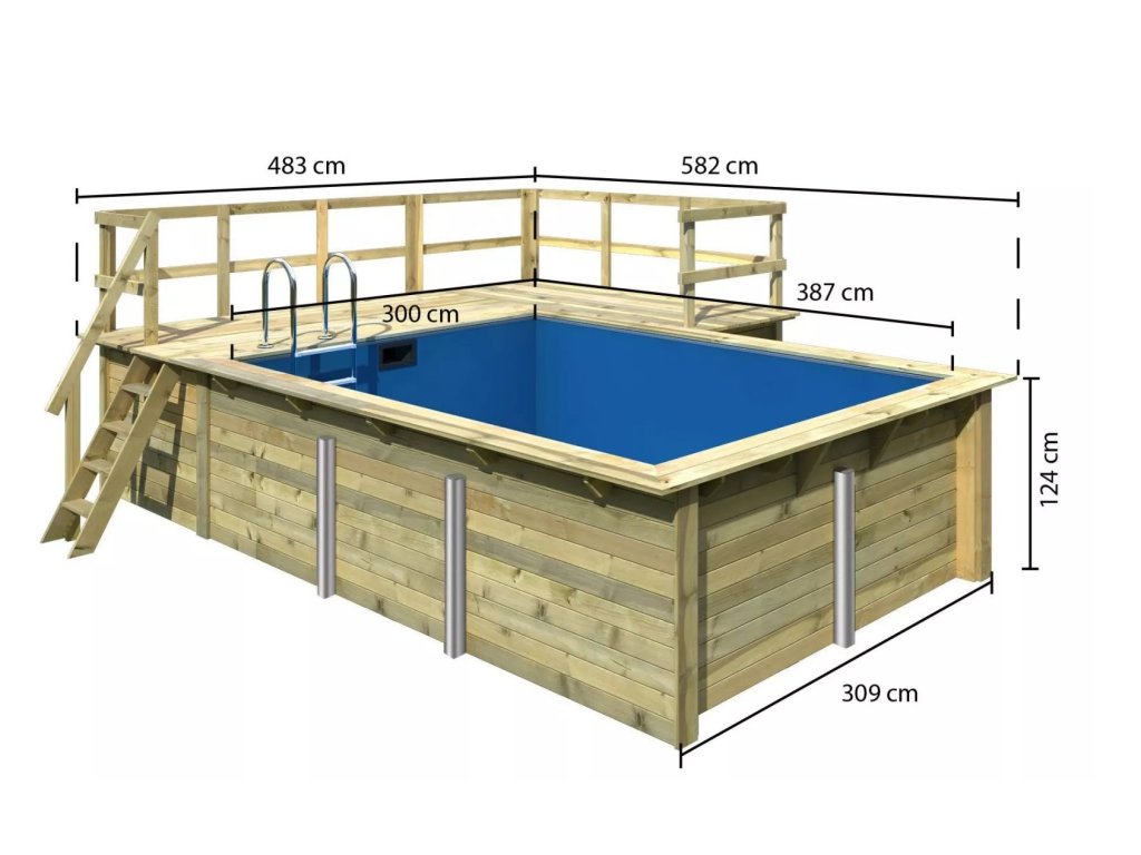 Konstrukce bazénu je vyrobena z dřevěných profilů (systém dvojité pero / drážka) síly 44 mm. Vnitřní prostor je vyplněn pevnou modrou PVC fólií o síle 0,6 mm.