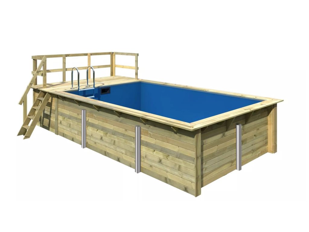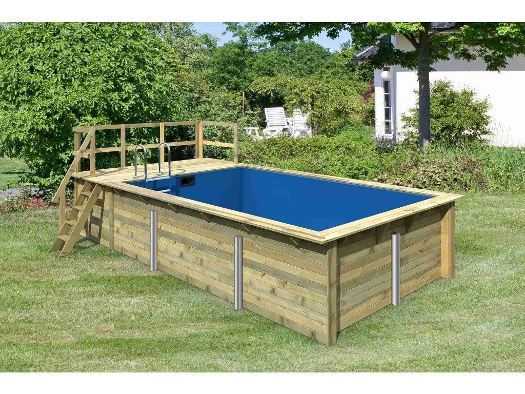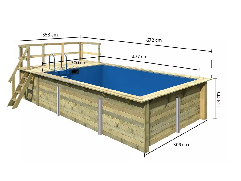 Konstrukce bazénu je vyrobena z dřevěných profilů (systém dvojité pero / drážka) síly 44 mm. Vnitřní prostor je vyplněn pevnou modrou PVC fólií o síle 0,6 mm.