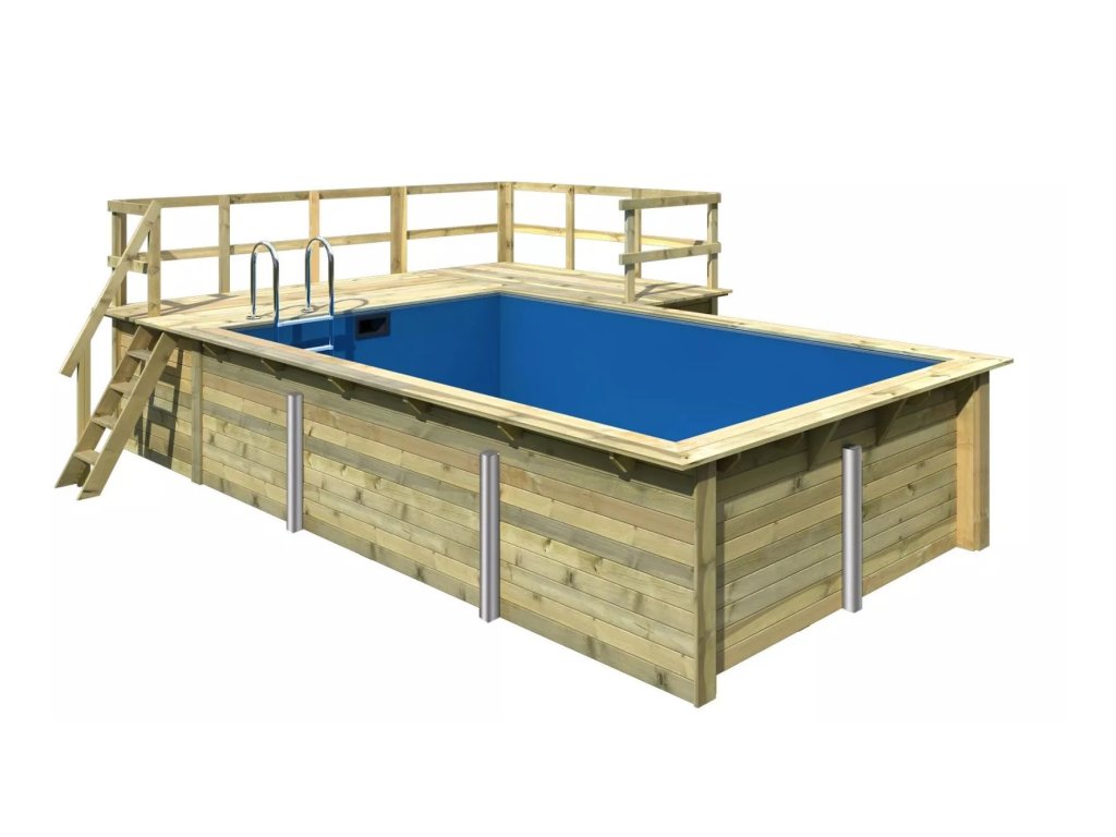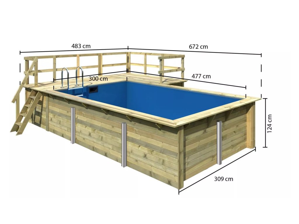 Konstrukce bazénu je vyrobena z dřevěných profilů (systém dvojité pero / drážka) síly 44 mm. Vnitřní prostor je vyplněn pevnou modrou PVC fólií o síle 0,6 mm.