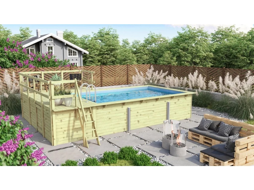 Zaplavat si v chladivé vodě, odpočinout na lehátku a příjemné chvilky zapít lahodným koktejlem. Pro většinu z nás to zní jako perfektní letní den. A takový den můžete prožít i ve vlastní zahradě. S našimi bazény se tyto vaše sny stanou reálnou skutečností. Bazén má objem pro cca 15 500 litrů vody a výšku hladiny max. 111 cm. Vnější dřevěný žebřík ze severského smrku a žebřík z nerezové oceli vám usnadní vstup do chladné vody (obojí je obsahem základního balení).