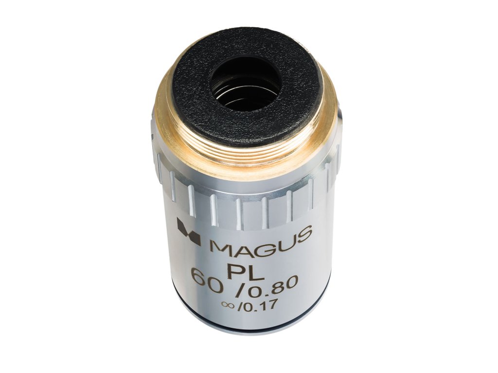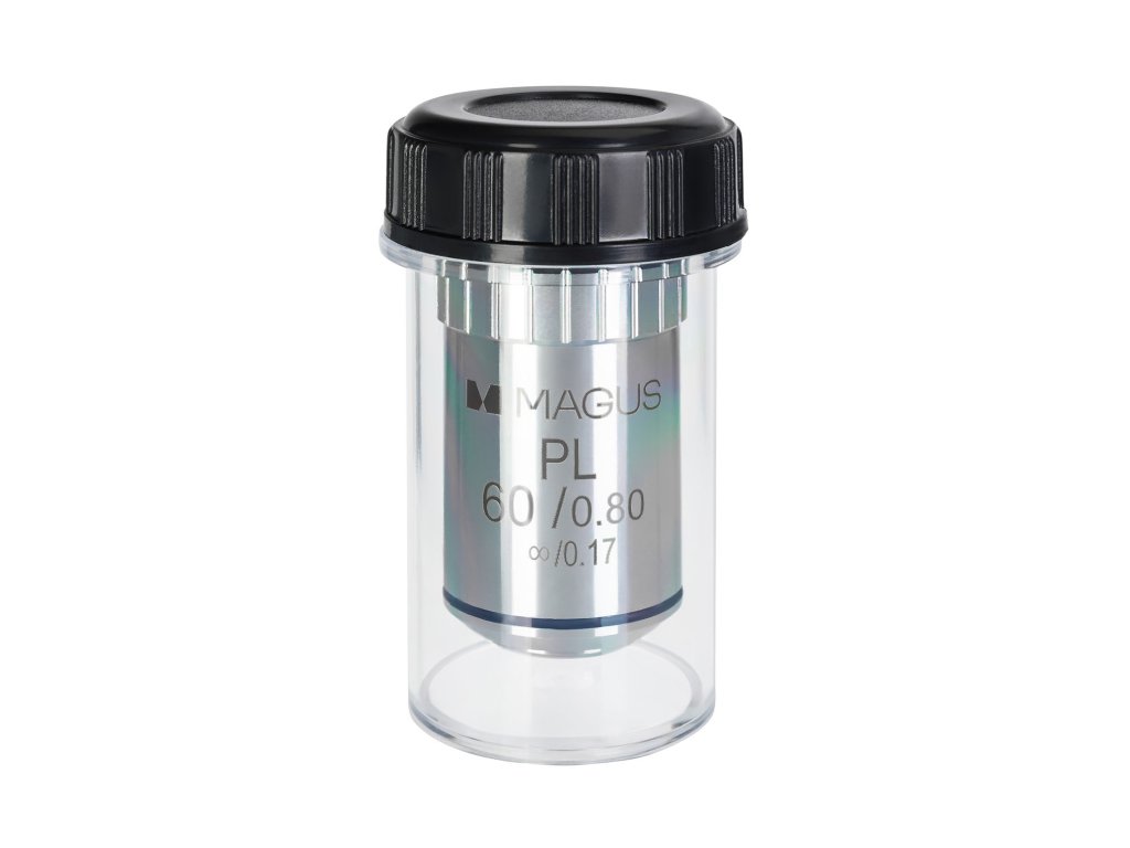 Pro pozorování s objektivem s rovinnou korekcí MAGUS MP60 60x/0,80 ∞/0,17 používejte okuláry se zvětšením v rozsahu od 7x do 14x. Při pozorování používejte krycí sklíčko o tloušťce 0,17 mm. Parfokální objektiv má minimální zkreslení, je vhodný pro digitální fotografování a lze jej používat s širokoúhlými okuláry se zorným polem 22 mm.