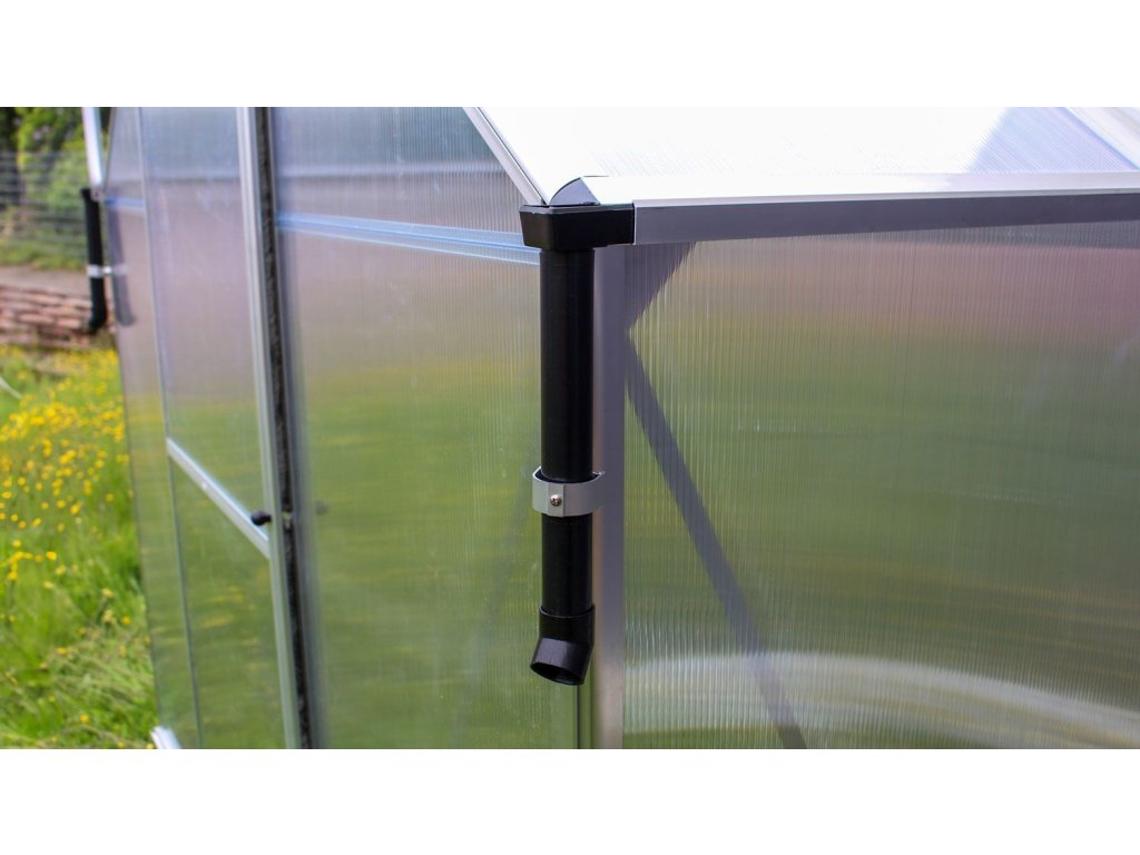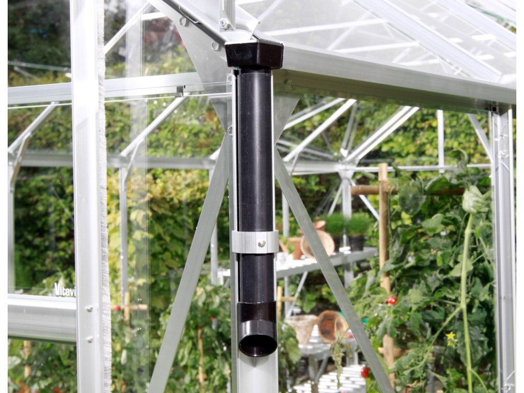 Malý černý plastový svod dešťové vody z okapů skleníku. Na svod lze napojit hadici a dešťovku tak odvádět do zásobníku.