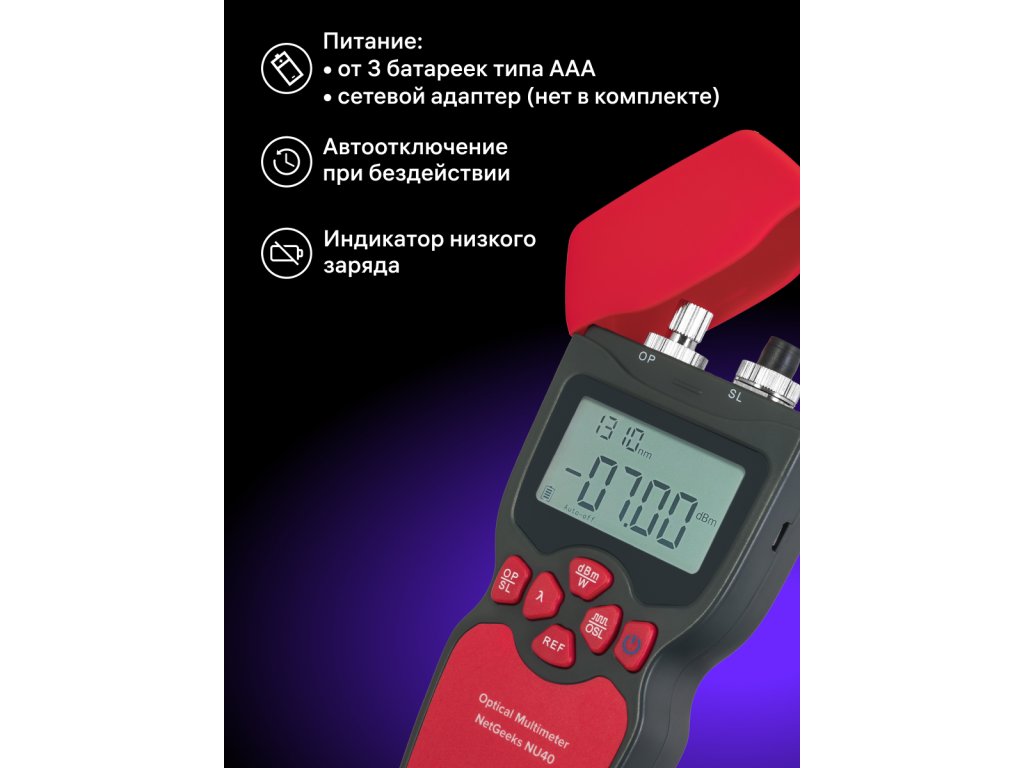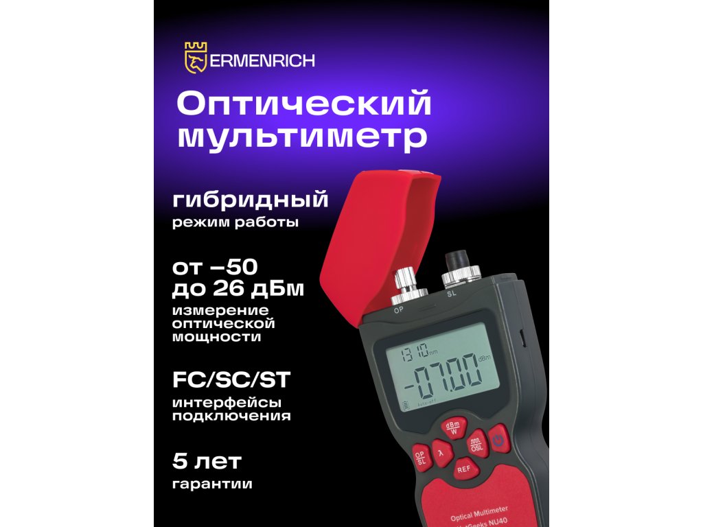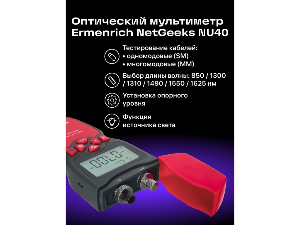 Optický multimetr neboli měřič optického výkonu Ermenrich NetGeeks NU40 – nezbytný nástroj pro profesionály, kteří instalují a udržují optické komunikační linky (FOCL). Přístroj umožňuje měřit absolutní výkon a zjišťovat ztráty mezi dvěma body vedení. Přístroj disponuje funkcí světelného zdroje pro kontrolu optických kabelů. Multimetr je vybaven dvěma konektory a podporuje hybridní provozní režim: při testování kabelu může současně fungovat jako měřič optického výkonu i jako zdroj světla pro vyhodnocení ztráty signálu.