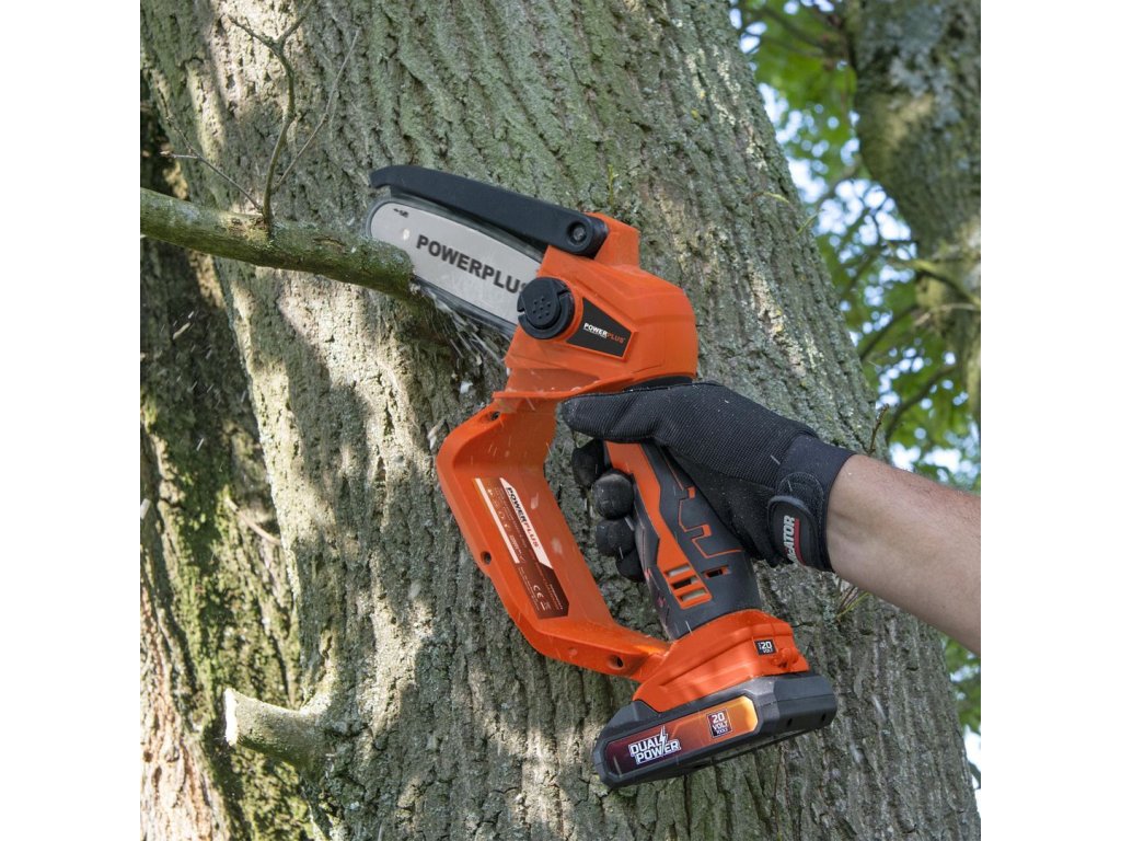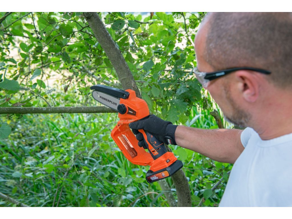 Díky kompaktnímu designu můžete tuto prořezávací Aku pilu 20V POWDPG7572 od PowerPlus ovládat pouze jednou rukou.