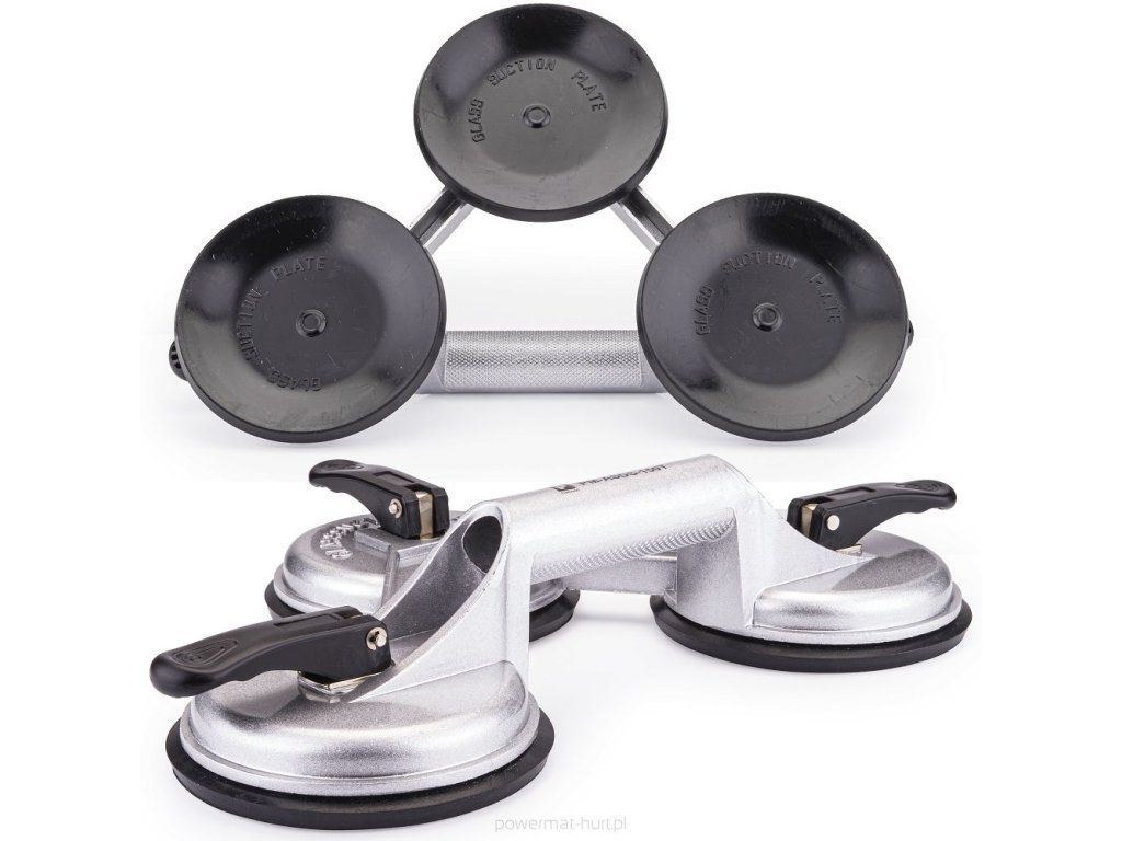 Víceúčelová rukojeť s přísavkou značky Powermat. Určeno pro manipulaci s různými prvky s hladkým povrchem, např. sklem, okny, autoskly, plechy, lamináty atd., jejichž hmotnost nepřesahuje 150 kg. Hliníkové tělo a gumová přísavka zajišťují bezpečnou a bezpečnou manipulaci se součástmi. Široká škála aplikací usnadní práci profesionálům i amatérům