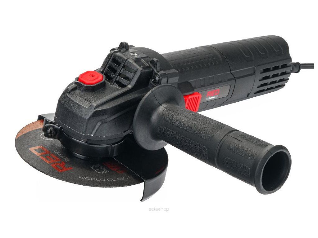 Úhlová bruska moderní značky RED TECHNIC určená pro řezání, broušení, čištění materiálů jako jsou: kov, dřevo, beton, plasty a mnoho dalších