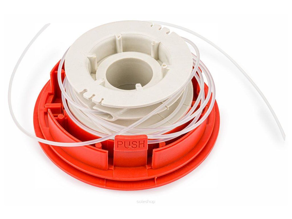 - Zakládání struny se provádí rychle a bez nutnosti demontáže hlavy - stačí odstřihnout několik metrů dlouhý kus monofilu, provléknout očka těla a navinout knoflíkem