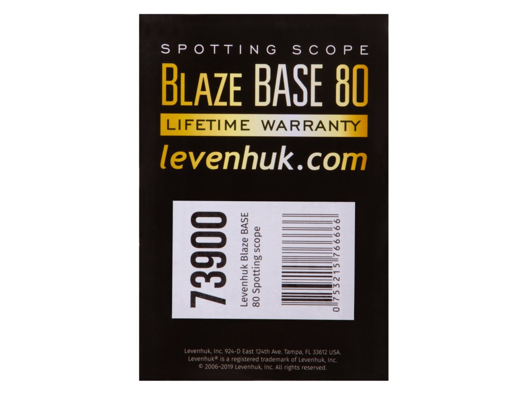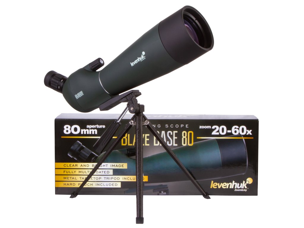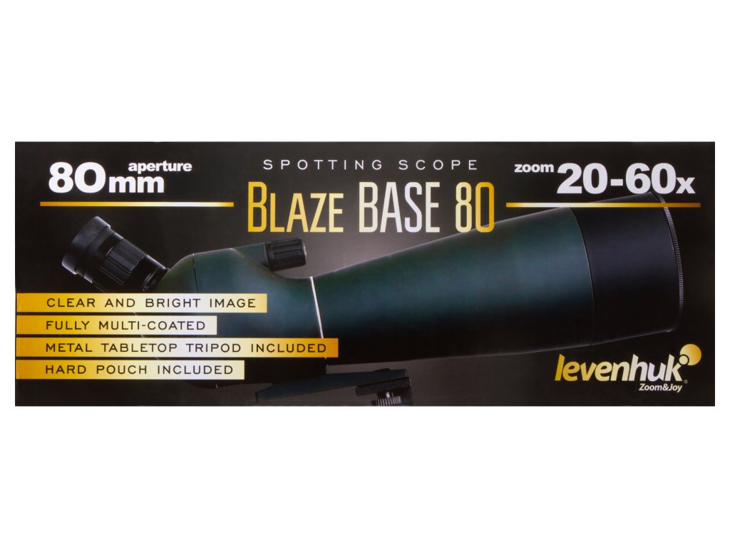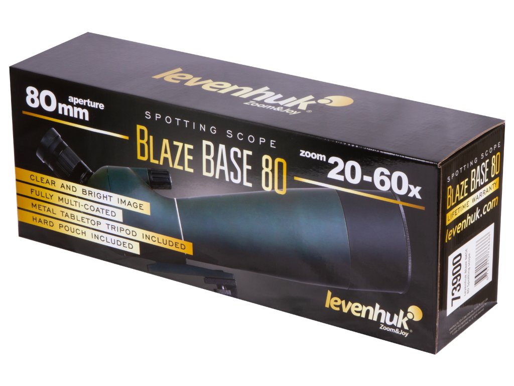 Levenhuk Blaze BASE 80 má plastovou konstrukci. Je přizpůsobitelný jakémukoliv standardnímu stativu se závitem 1/4". Sada obsahuje kovový stativ, který umožňuje umístění pozorovacího dalekohledu na stůl nebo okenní parapet. Pro skladování a přepravu se používá dodávané pevné pouzdro.