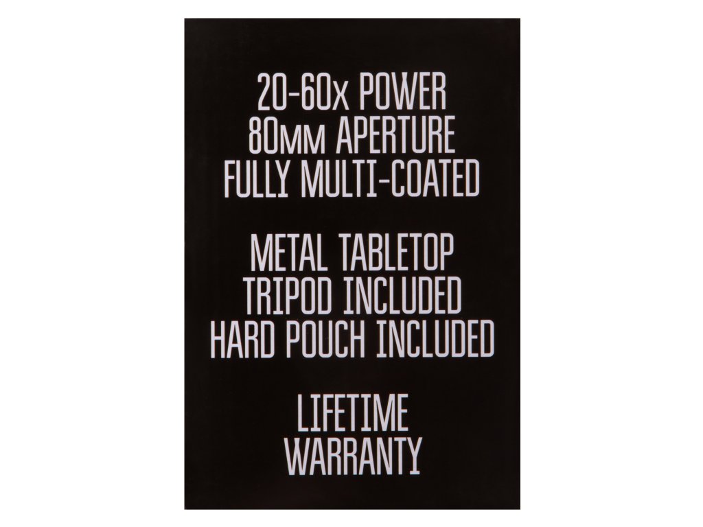 Optika v tomto pozorovacím dalekohledu je vyrobena ze skla BK-7. Veškeré optické prvky, které jsou vystaveny vlivu vzduchu, jsou potaženy několika vrstvami antireflexního povlaku. Tento pozorovací dalekohled umožňuje plynulé variabilní zvětšování v rozsahu 20x až 60x. Díky velkému objektivu s funkcí absorpce světla může pozorovací dalekohled absorbovat velké množství světla a poskytovat jasný a kontrastní obraz i za oblačného počasí nebo za soumraku. Dlouhý oční reliéf umožňuje pozorování s nasazenými brýlemi.