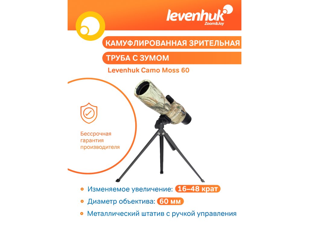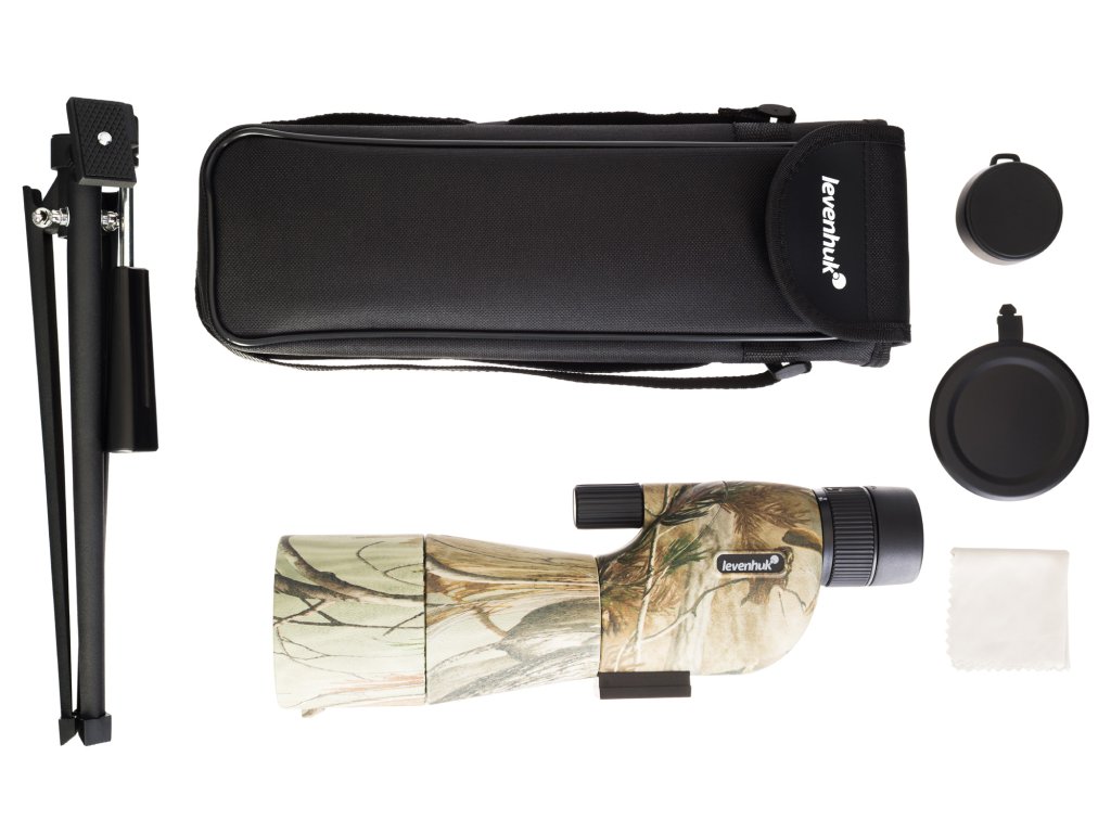 Pozorovací dalekohled Levenhuk Camo 60 je výkonný optický nástroj pro pozorování pozemních objektů. Protože je trubice přímá, je vhodná pro pozorování, kdy je zorný úhel přímý nebo shora dolů, např. z věže nebo z kopce. Dalekohled se bude hodit a bude účinný při lovu, střelbě z pušky i při ochraně území a hranic a klasickém pozorování krajiny. Dodává se s malým kovovým stativem, který se ovládá nastavovacím knoflíkem.