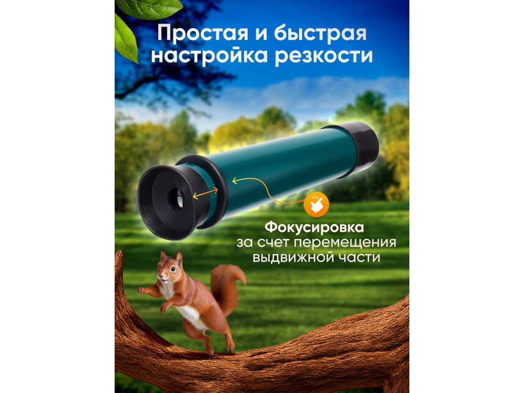 Zaměřit pozorovací dalekohled na cíl je snadné: pohybujte posuvnou částí pozorovacího dalekohledu, která je blíže k okuláru, tam a zpět. Pozorovací dalekohled je vybaven očnicí z měkké pryže, takže i dlouhodobé pozorování bude pohodlné. Kompaktní tělo pozorovacího dalekohledu je vyrobeno z odolného a lehkého ABS plastu, který jej chrání před poškozením. Takový přístroj lze snadno nosit všude tam, kam má mladý objevitel přírody namířeno.