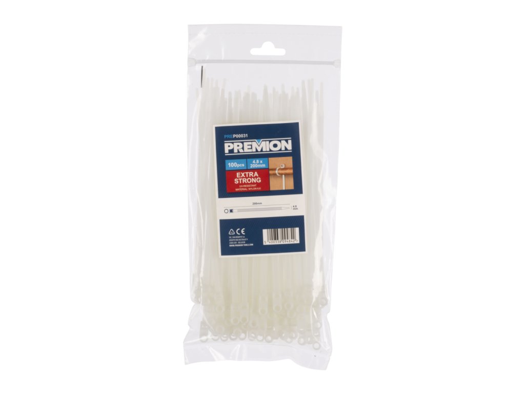 Tato sada PREP00031 od Premion obsahuje 100 ks bílých nylonových stahovacích pásek 4,8 x 200 mm s otvorem.Tyto extra pevné stahovací pásky mají vysokou pevnost v tahu.