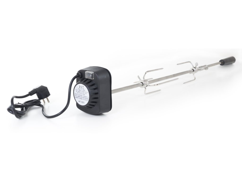 Z jedné strany je jehla opatřena odnímatelným plastovým držadlem, na kterém je praktické očko pro uchycení. Z druhé strany se nachází motorek v plastovém krytu, na kterém je umístěno tlačítko na zapínání / vypínání. Motorek s napětím 230 V jednoduše zapojíte do elektřiny pomocí kabelu v délce cca 125 cm. Motorek s jehlou otáčí rychlostí asi 2 otáčky za minutu, aby se připravovaný pokrm nepřipékal, ale pekl se rovnoměrně.