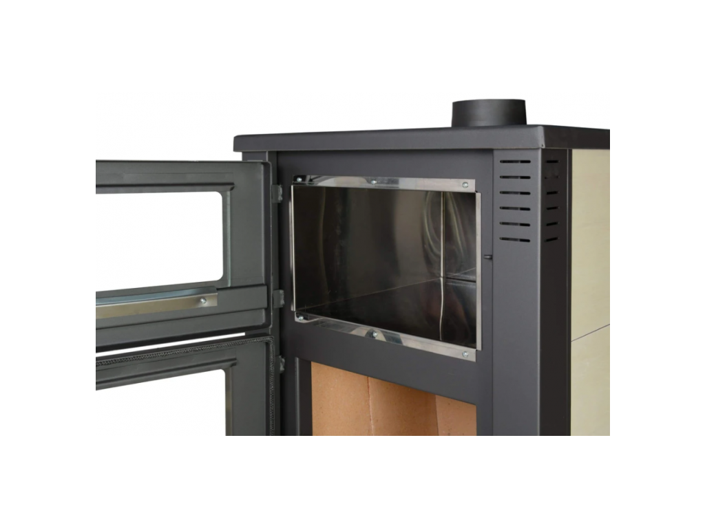 Součástí je i praktická samostatná nádoba na popel pro snadné vyprazdňování zbytků po spalování. Prostorná spalovací komora umožňuje vložit polena o délce cca 45 cm. Oddělený přívod primárního a sekundárního vzduchu zajišťuje optimální energetický výnos. Kamna jsou pečlivě utěsněna. Pec lze velmi rychle zahřát na provozní teplotu.