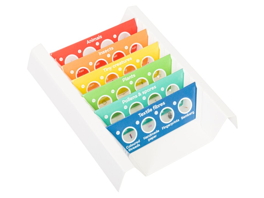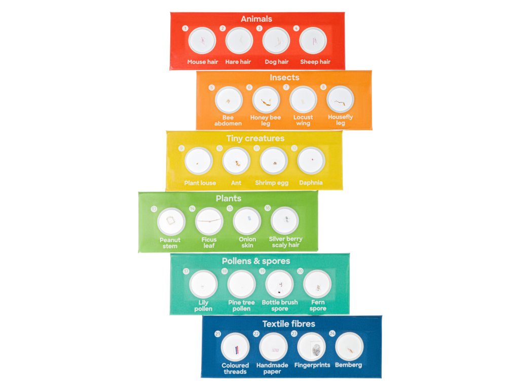 Všechny preparáty jsou rozděleny do šesti skupin. Každé podložní sklo představuje jednu skupinu a obsahuje čtyři preparáty. Každý preparát je označen tak, aby bylo možné rychle najít ten, který chcete zkoumat. Chcete-li začít zkoumat, stačí preparát položit na stolek mikroskopu, podle potřeby upravit optiku a osvětlení – a vše připraveno! S touto sadou se dozvíte nové věci o mikrosvětě.