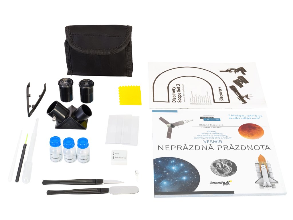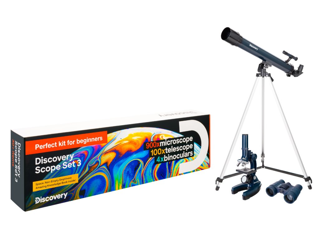 Sada Levenhuk Discovery Scope 3 kombinuje mikroskop, hvězdářský dalekohled a binokulární dalekohled v jedné sadě. Kromě optických zařízení obsahuje sada více než 30 dílů příslušenství a vzdělávací publikaci „Vesmír. Neprázdná prázdnota“. Sada byla vytvořena speciálně pro ty, kteří dosud nepoužívali optická zařízení a chtějí si vyzkoušet studium různých předmětů. Sada je zabalena v pestrobarevné krabici, takže je vhodná jako skvělý dárek.