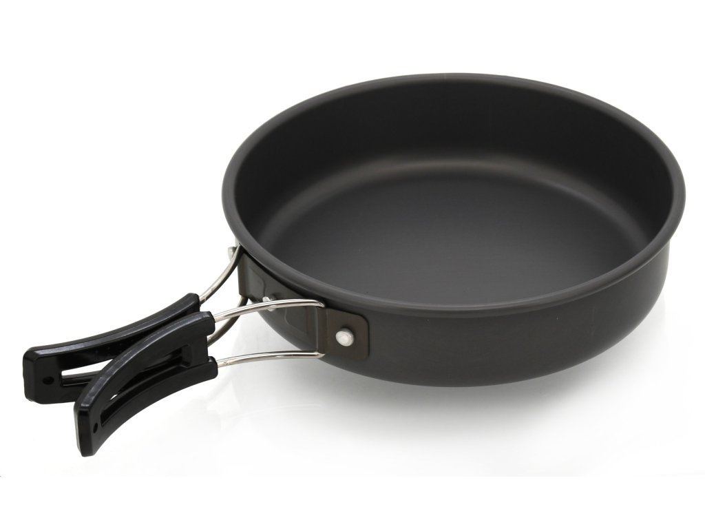 Tato sada z anodizovaného hliníku obsahuje pánvičku 18 x 4 cm, kotlík 17 x 9 cm, konvici 15 x 7,5 cm a víko o průměru 17 cm. Díky odstupňovaným velikostem se dá nádobí složit do sebe. Pro pohodlnou manipulaci jsou hrnce vybavené sklápěcími držáky se silikonovými návleky. Vše je navíc uložené v praktické sítěné tašce, takže se sada skvěle přenáší.
