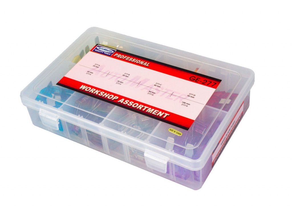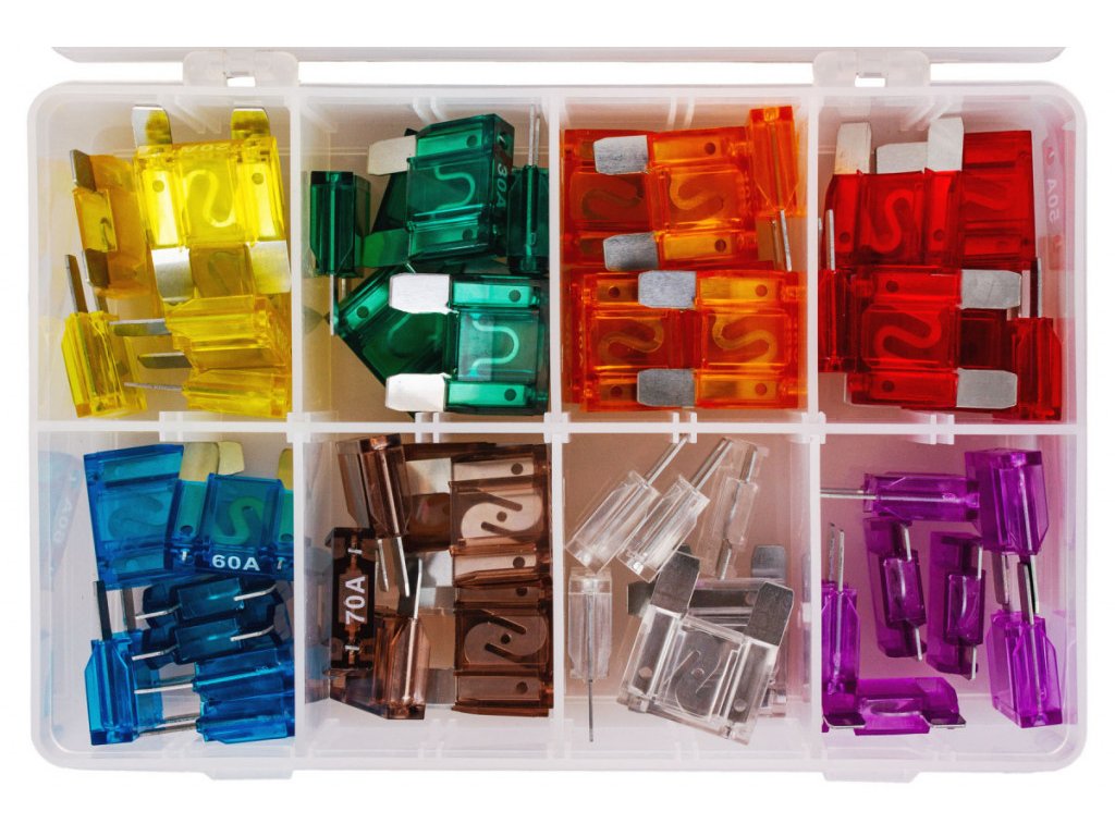 - Sada nožových pojistek pro použití v automobilech (max. 24V) v praktickém plastovém kufru.