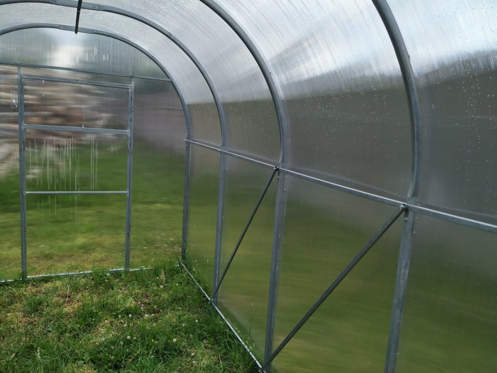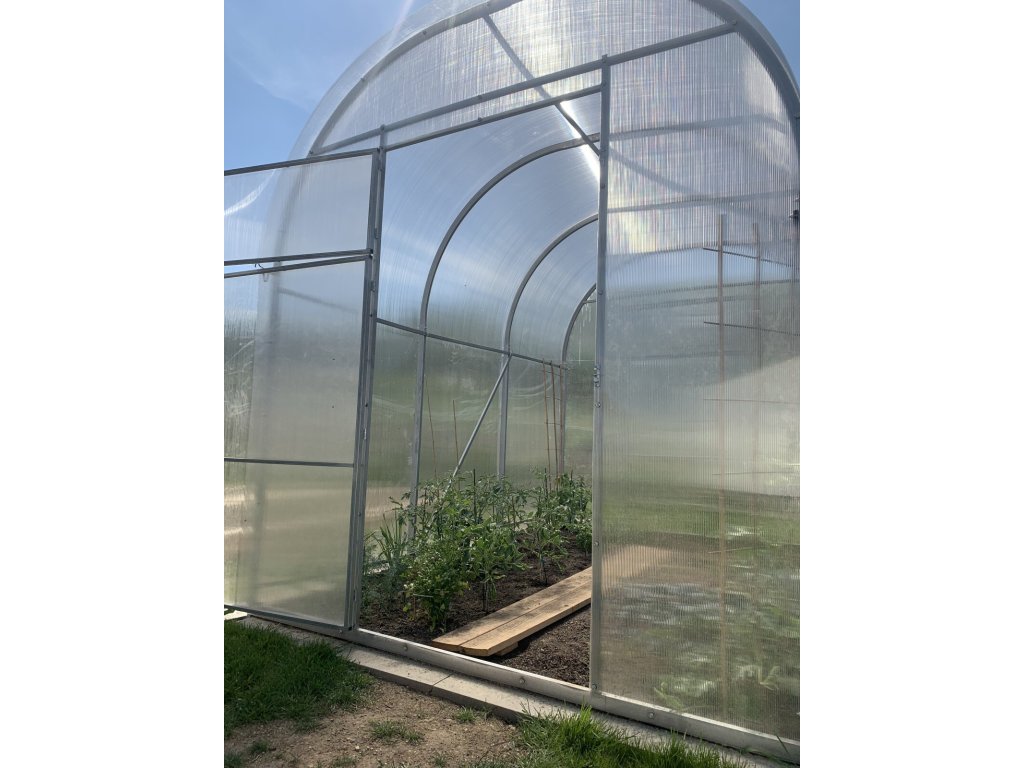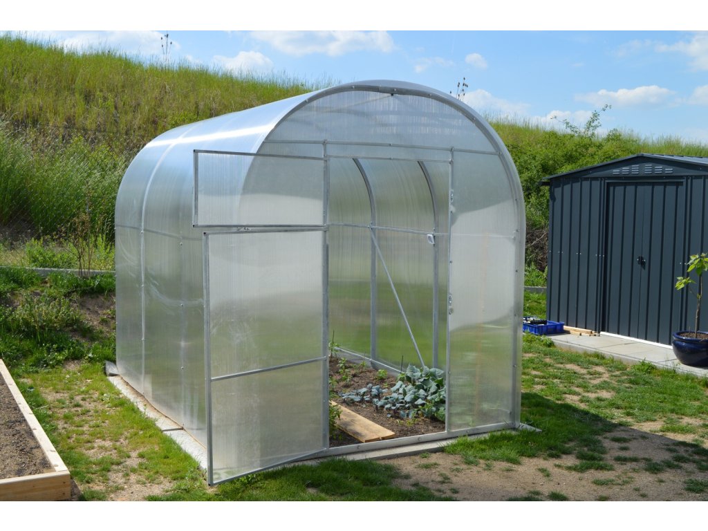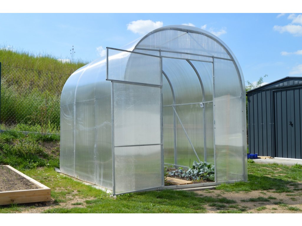 Konstrukce - konstrukce skleníku je z masivních obloukových trubek 40 x 20 mm (podélníky a vzpěry 20 x 15 mm). Materiál profilů je galvanicky pozinkovaný = na povrchu je vytvořená silná vrstva ochranného nekorodujícího zinku. Jednotlivá žebra nosných oblouků jsou od sebe vzdálena 100 cm. Použité materiály garantují vysokou únosnost celé konstrukce skleníku. Vzhledem k výraznému ohnutí polykarbonátového pláště dochází ke vzniku extrémně nosné klenby, takže skleník bez jakýchkoliv problémů odolá i větším přívalům sněhu. Přední a zadní čelo skleníku mají dvoudílné dveře, které lze spojit západkou v jeden celek nebo lze otevřít pouze horní část dveří jako okno v předním nebo zadním čelu. Skleník je průchozí. Jako příplatkové příslušenství lze dokoupit automatický otvírač větracího okénka.