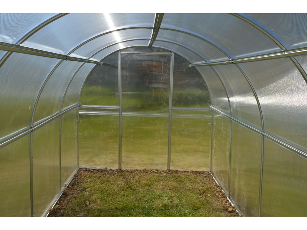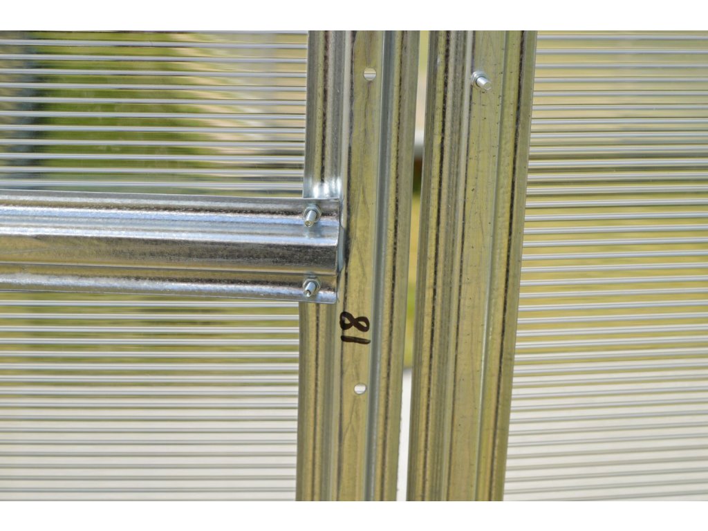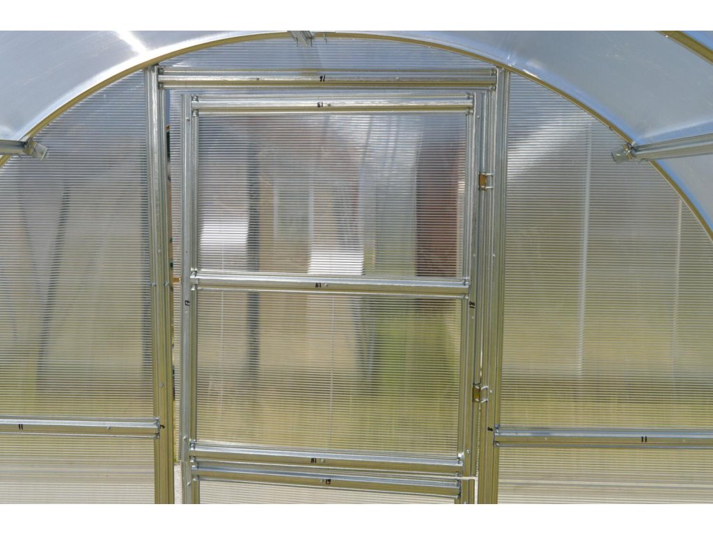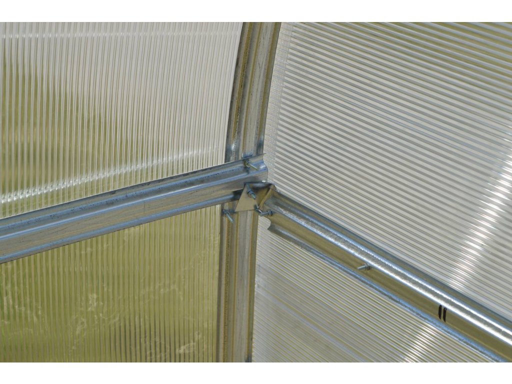 Konstrukce - konstrukce skleníku je sešroubovaná z pozinkovaných omega profilů síly 0,70 - 0,85 mm. Materiál profilů je galvanicky pozinkovaný. Jednotlivá žebra nosných oblouků jsou od sebe vzdálena pouhých 60 - 80 cm, což je velká výhoda tohoto modelu skleníku oproti jiným výrobkům na českém trhu. Malá rozteč oblouků 0,6 - 0,7 m garantuje vysokou únosnost celé konstrukce skleníku. Přední a zadní čela skleníku mají vestavěné dvojité dveře, takže skleníkem je možné procházet z obou stran. Pokud otevřete horní část dveří na obou koncích skleníku, zajistíte tím pohodlné větrání celého skleníku, aniž by do něj měly přístup děti nebo domácí zvířata. V případě, že nechcete montovat druhé dveře v zadní části skleníku, je možné do stěny umístit větrací okénko, do kterého lze namontovat automatický otvírač LANITPLAST (k zakoupení jako doplňkové příslušenství).