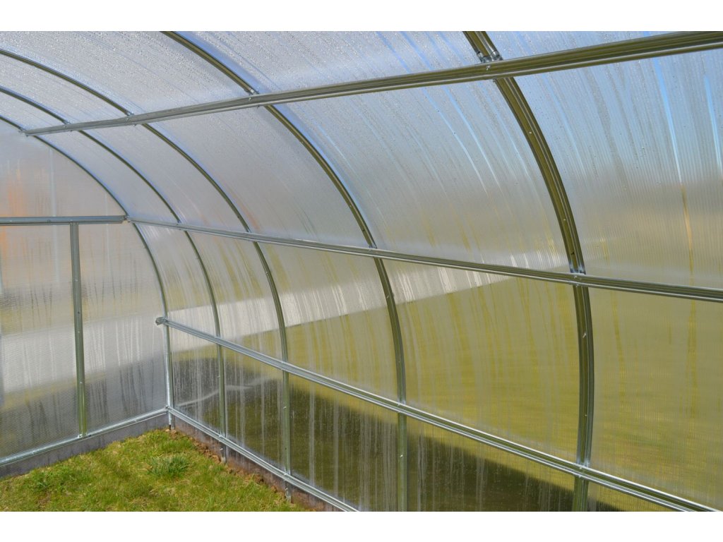 Polykarbonát - prémiový britský dvoustěnný polykarbonát 4 mm se silným UV filtrem (nekřehne, nežloutne). Z důvodu zajištění maximální kvality je prosklení vyrobeno z kvalitního polykarbonátu MARLON (výrobce Brett Martin Velká Británie), který v ČR prošel náročnými testy ve státem akreditovaných zkušebnách jako stavební materiál. Navíc disponuje zkušebním protokolem ze Státního zdravotního ústavu Praha, který potvrzuje, že se z polykarbonátu neuvolňují žádné škodlivé látky. Můžete tak nerušeně pěstovat zeleninu bez obav o své zdraví. Smluvní prodloužená záruka 10 let na nerozbitnost polykarbonátu krupobitím je u skleníků od LANIT PLASTU samozřejmostí.