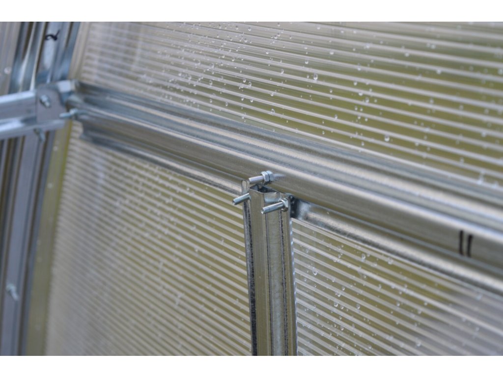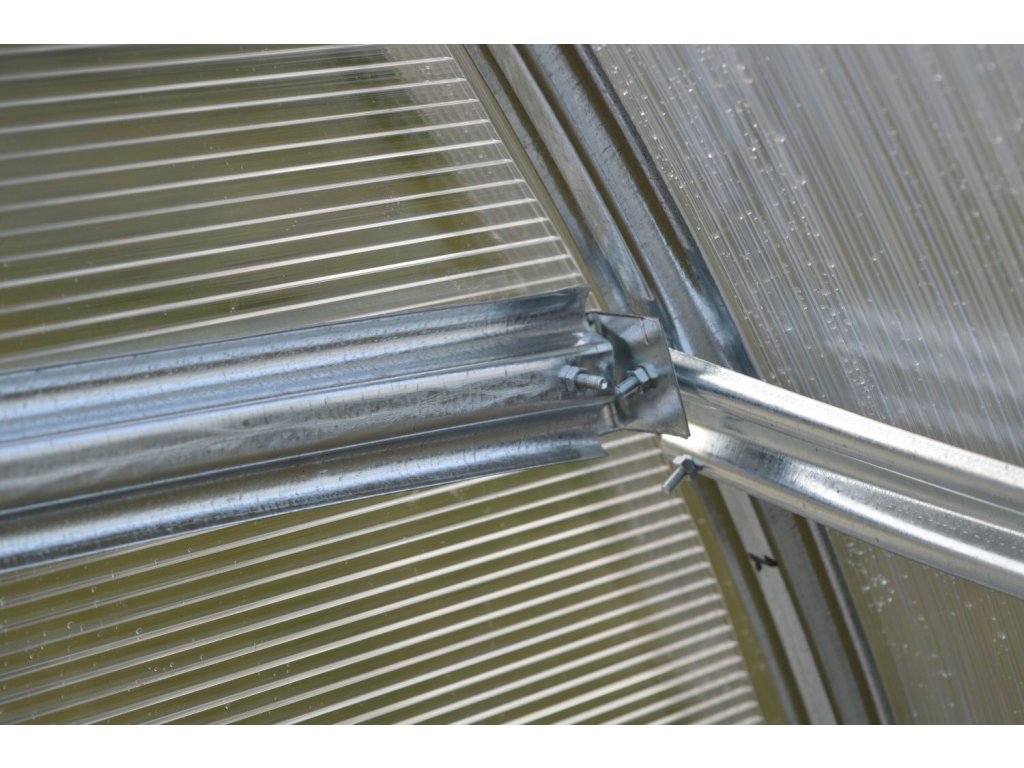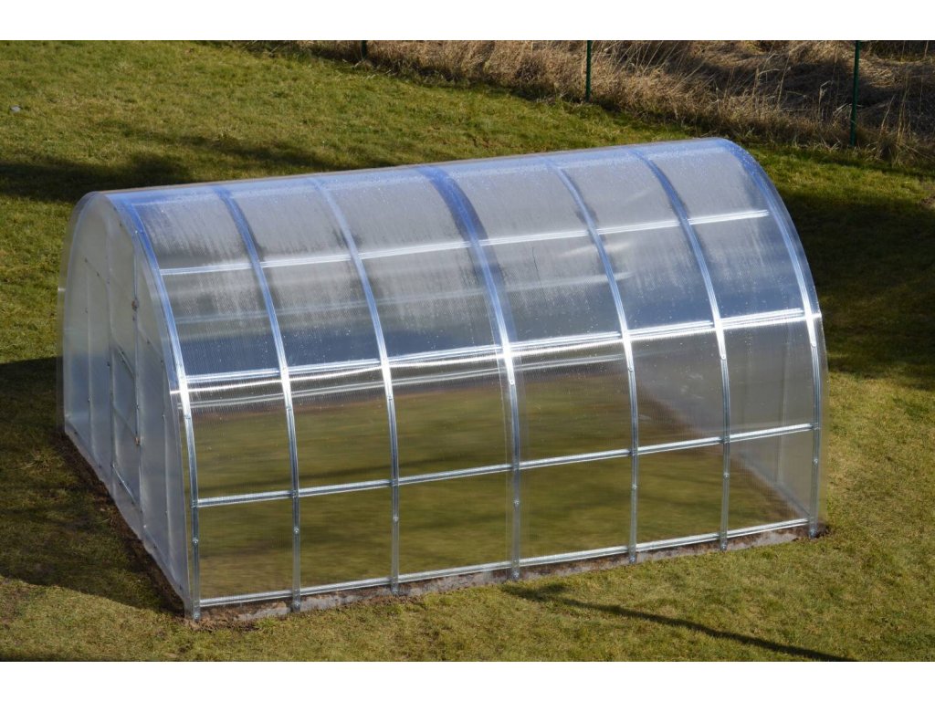 Konstrukce - konstrukce skleníku je sešroubovaná z pozinkovaných omega profilů síly 0,70 - 0,85 mm. Materiál profilů je galvanicky pozinkovaný. Jednotlivá žebra nosných oblouků jsou od sebe vzdálena pouhých 60 - 80 cm, což je velká výhoda tohoto modelu skleníku oproti jiným výrobkům na českém trhu. Malá rozteč oblouků 0,6 - 0,7 m garantuje vysokou únosnost celé konstrukce skleníku. Přední a zadní čela skleníku mají vestavěné dvojité dveře, takže skleníkem je možné procházet z obou stran. Pokud otevřete horní část dveří na obou koncích skleníku, zajistíte tím pohodlné větrání celého skleníku, aniž by do něj měly přístup děti nebo domácí zvířata. V případě, že nechcete montovat druhé dveře v zadní části skleníku, je možné do stěny umístit větrací okénko, do kterého lze namontovat automatický otvírač LANITPLAST (k zakoupení jako doplňkové příslušenství).