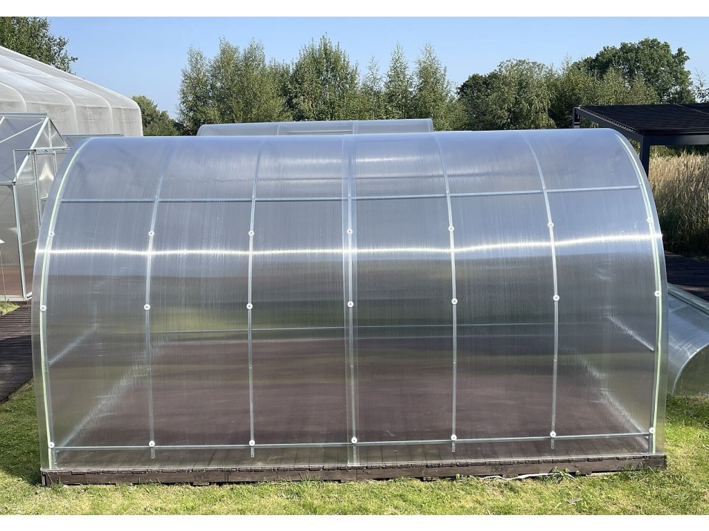 pozinkovaný ocelový profil 1mm, rozteč oblouků 67 cm , dvojité dveře vpředu, ventilační okno vzadu, prosklení nutno vyřezat z dodaných polykarbonátových desek, ocelová pozinkovaná základna, možnost montáže střešního okna - ano, originální těsnění pro zahradní skleníky (po obvodě předního a zadního čela)